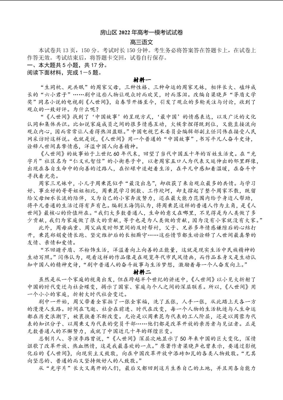 北京市房山区2022年高考第一次模拟测试试卷语文