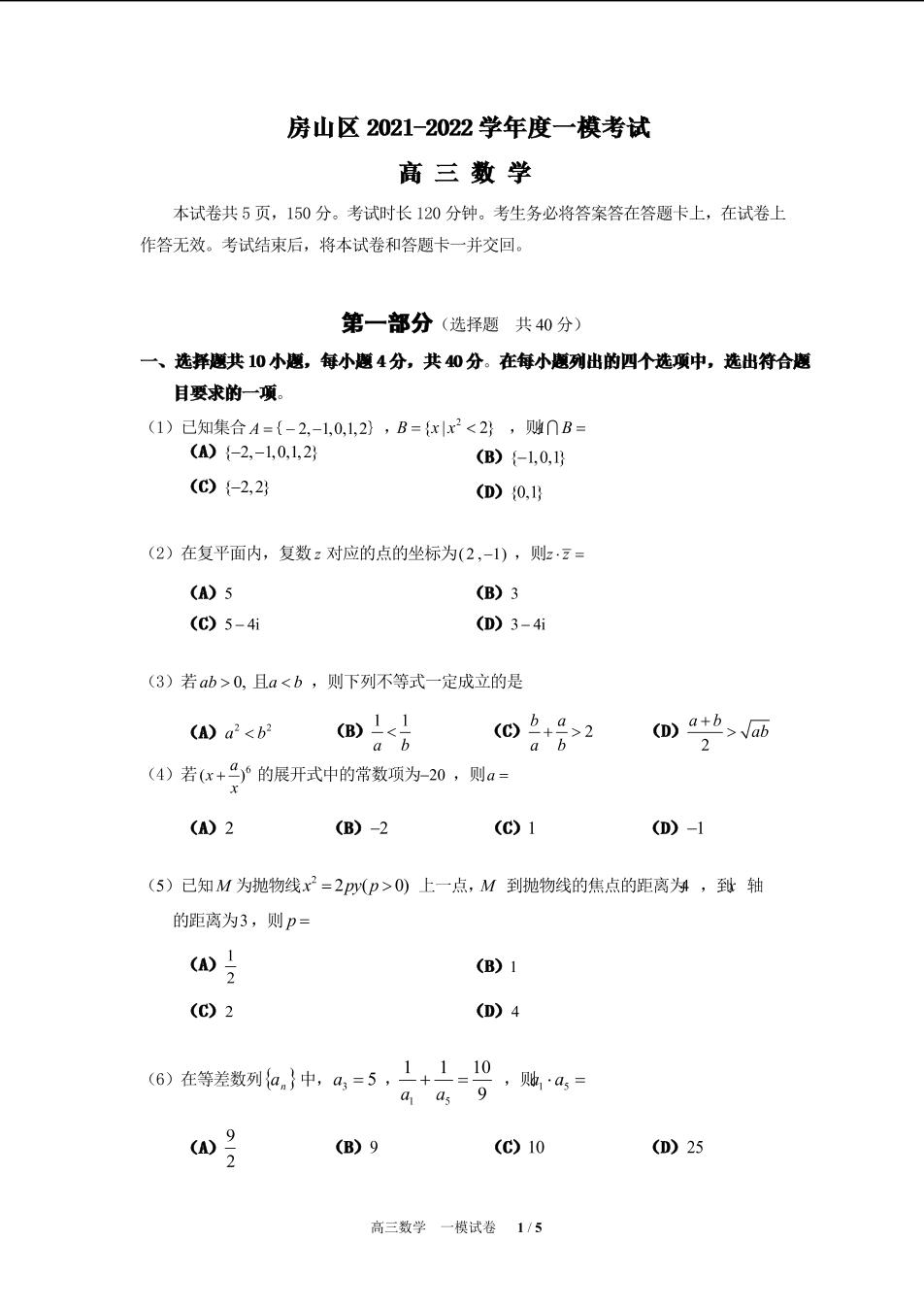 北京市房山区2022年高考第一次模拟测试试卷数学