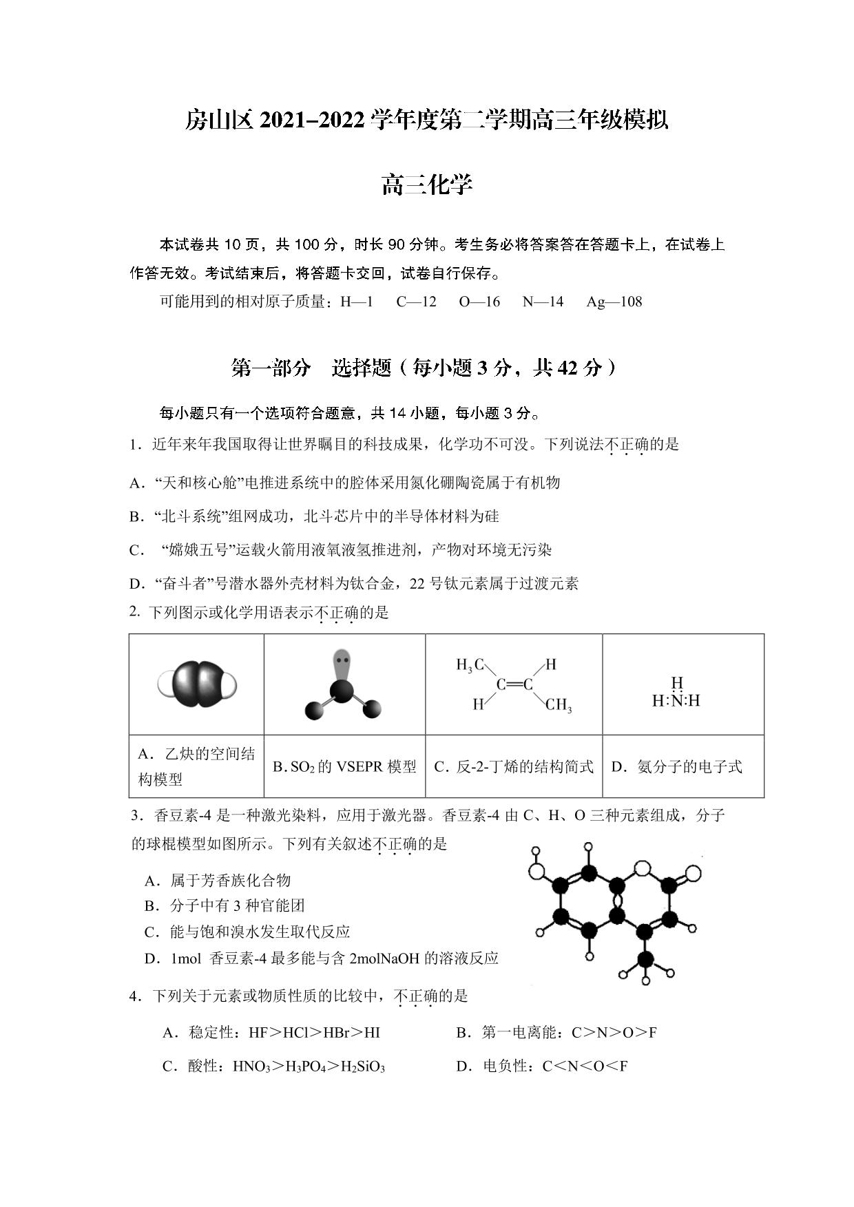 北京市房山区2022年高考第一次模拟测试试卷化学