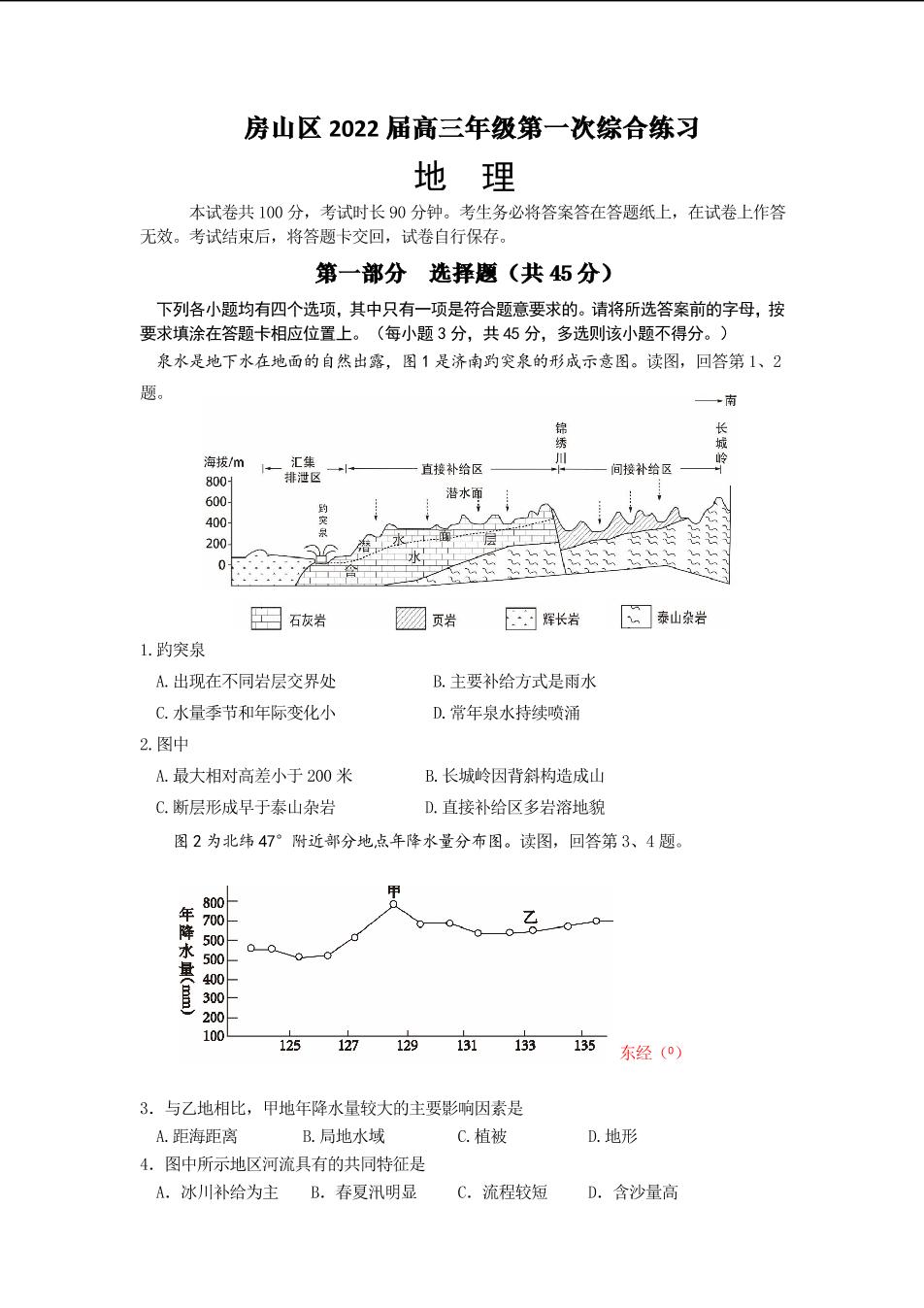 北京市房山区2022年高考第一次模拟测试试卷地理