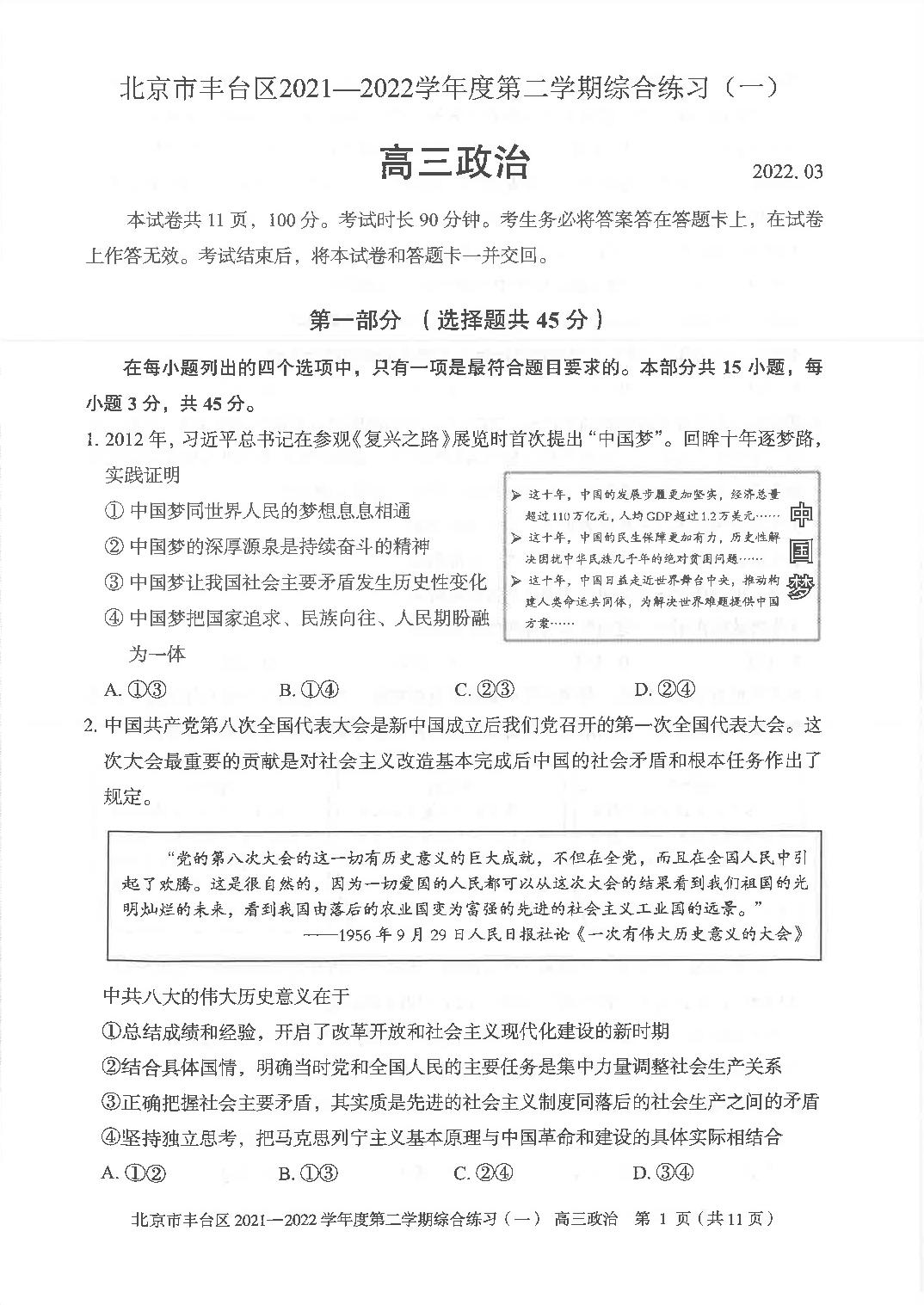 北京市丰台区2022年高考第一次模拟测试试卷政治