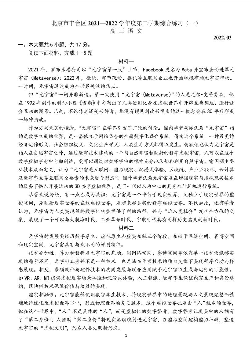 北京市丰台区2022年高考第一次模拟测试试卷语文