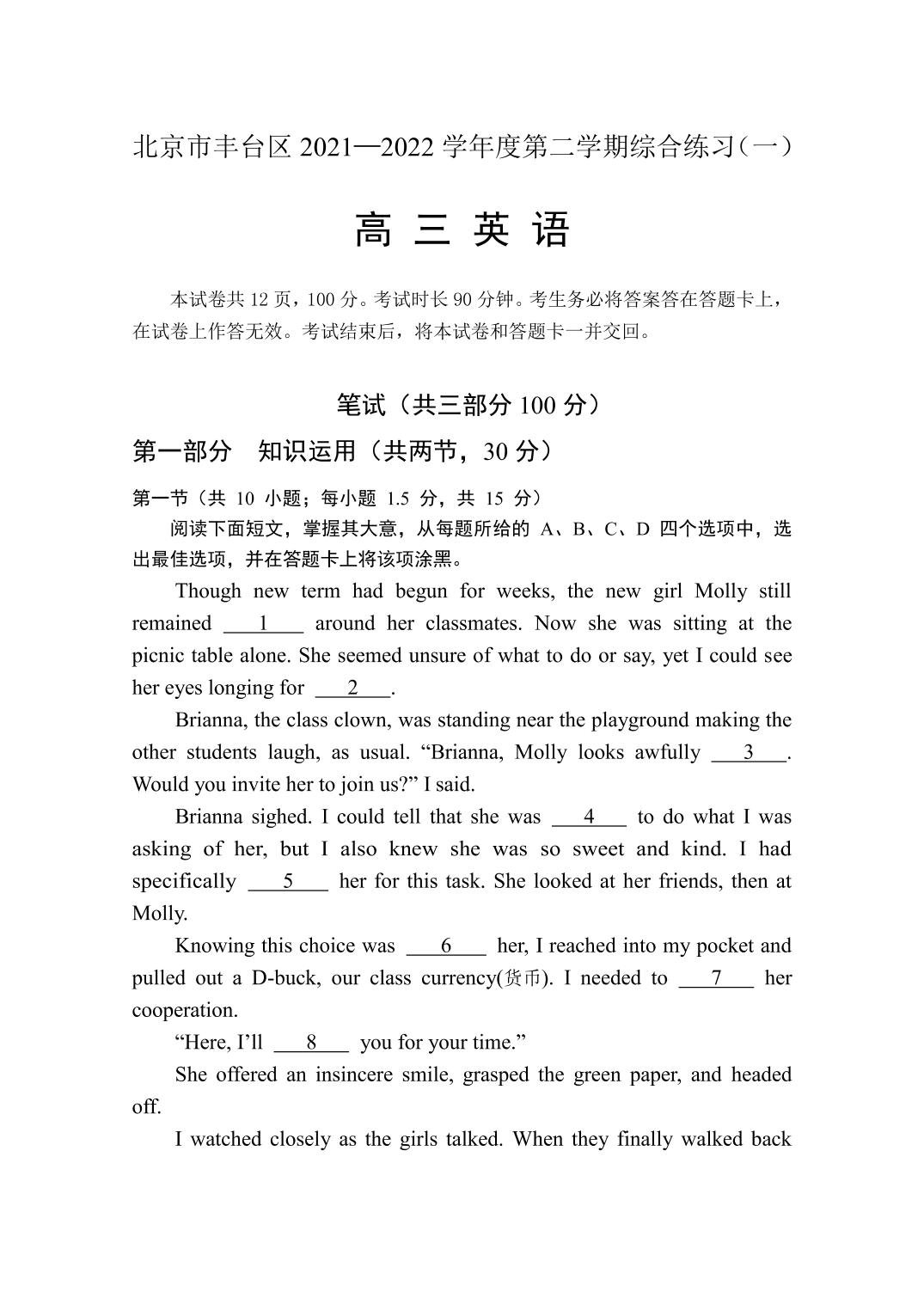 北京市丰台区2022年高考第一次模拟测试试卷英语【无听力音频】