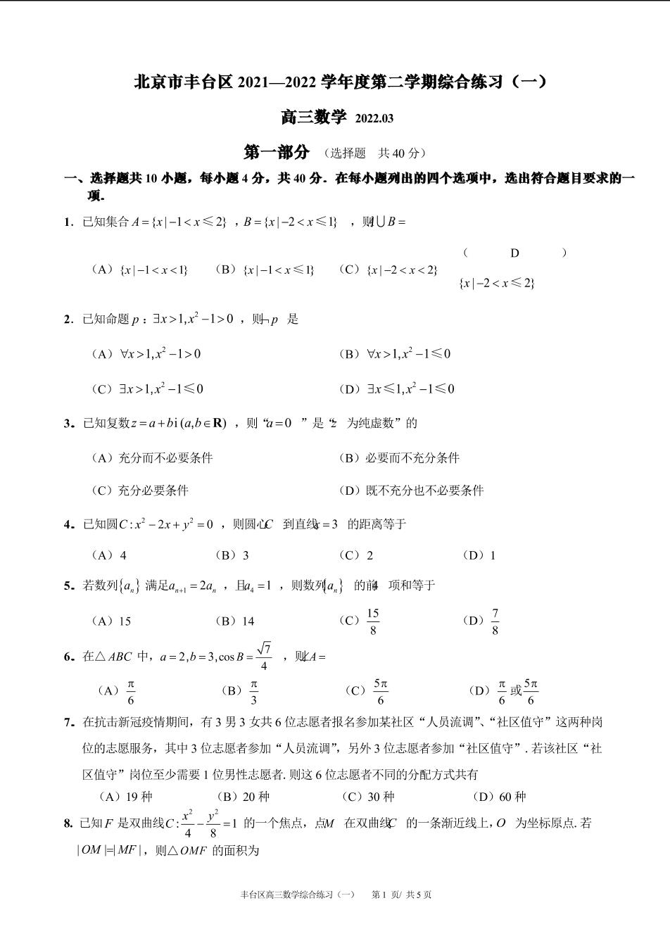 北京市丰台区2022年高考第一次模拟测试试卷数学