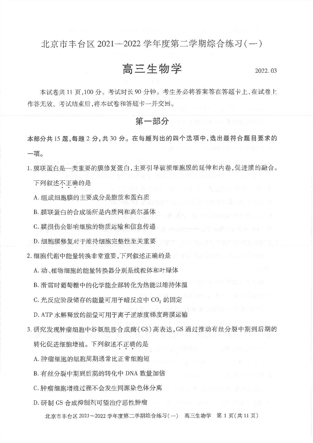 北京市丰台区2022年高考第一次模拟测试试卷生物