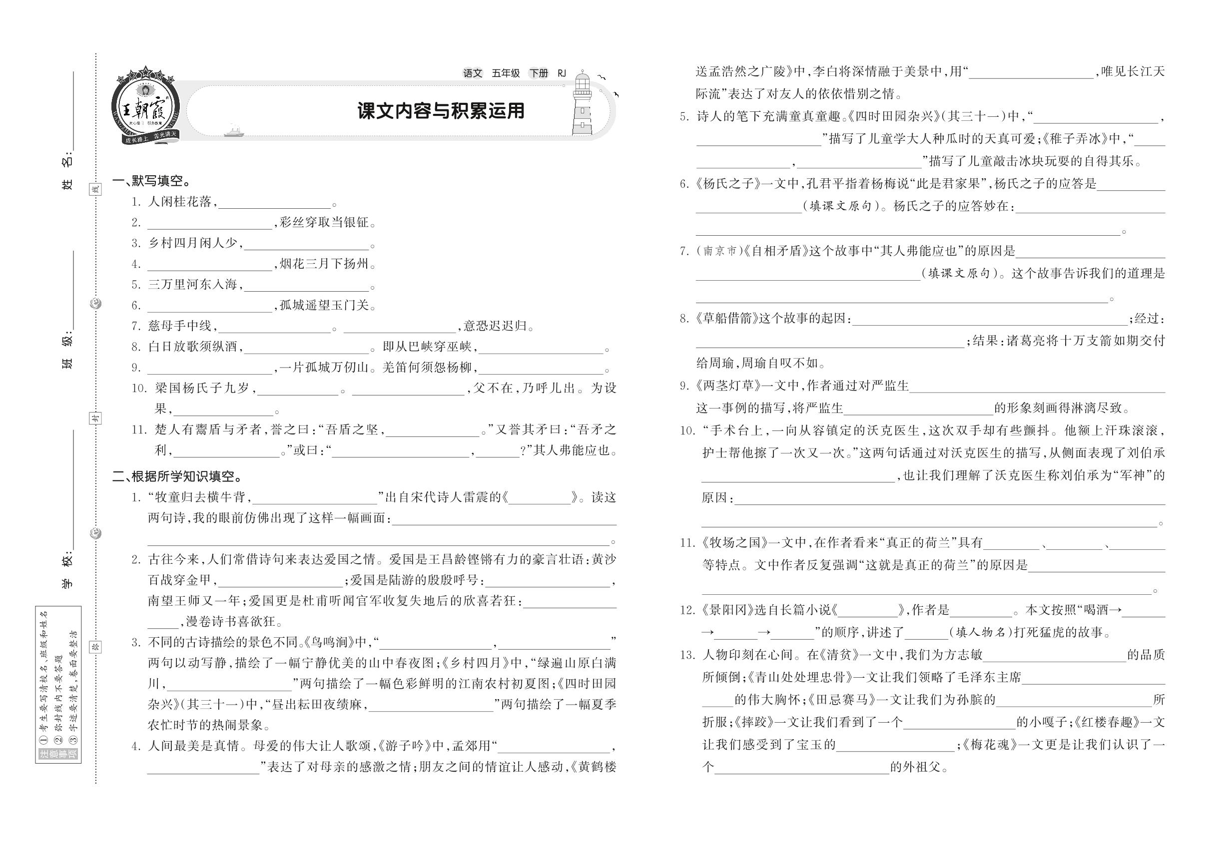【易考突破】人教版·五年级·语文课文内容与积累运用专项训练