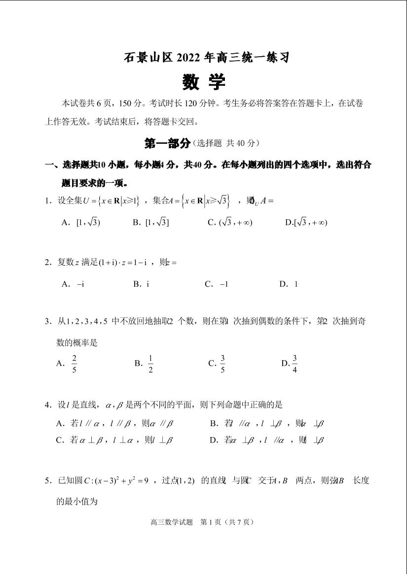 北京市石景山区2022年高考第一次模拟测试试卷数学