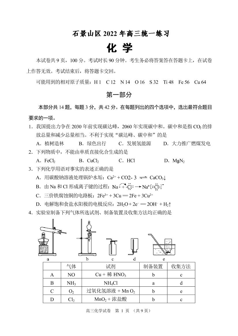 北京市石景山区2022年高考第一次模拟测试试卷化学