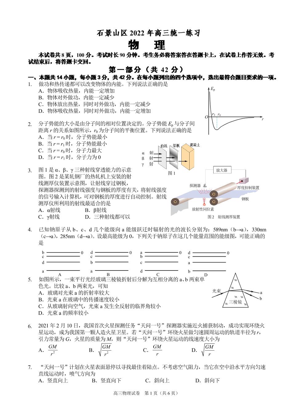 北京市石景山区2022年高考第一次模拟测试试卷物理试卷