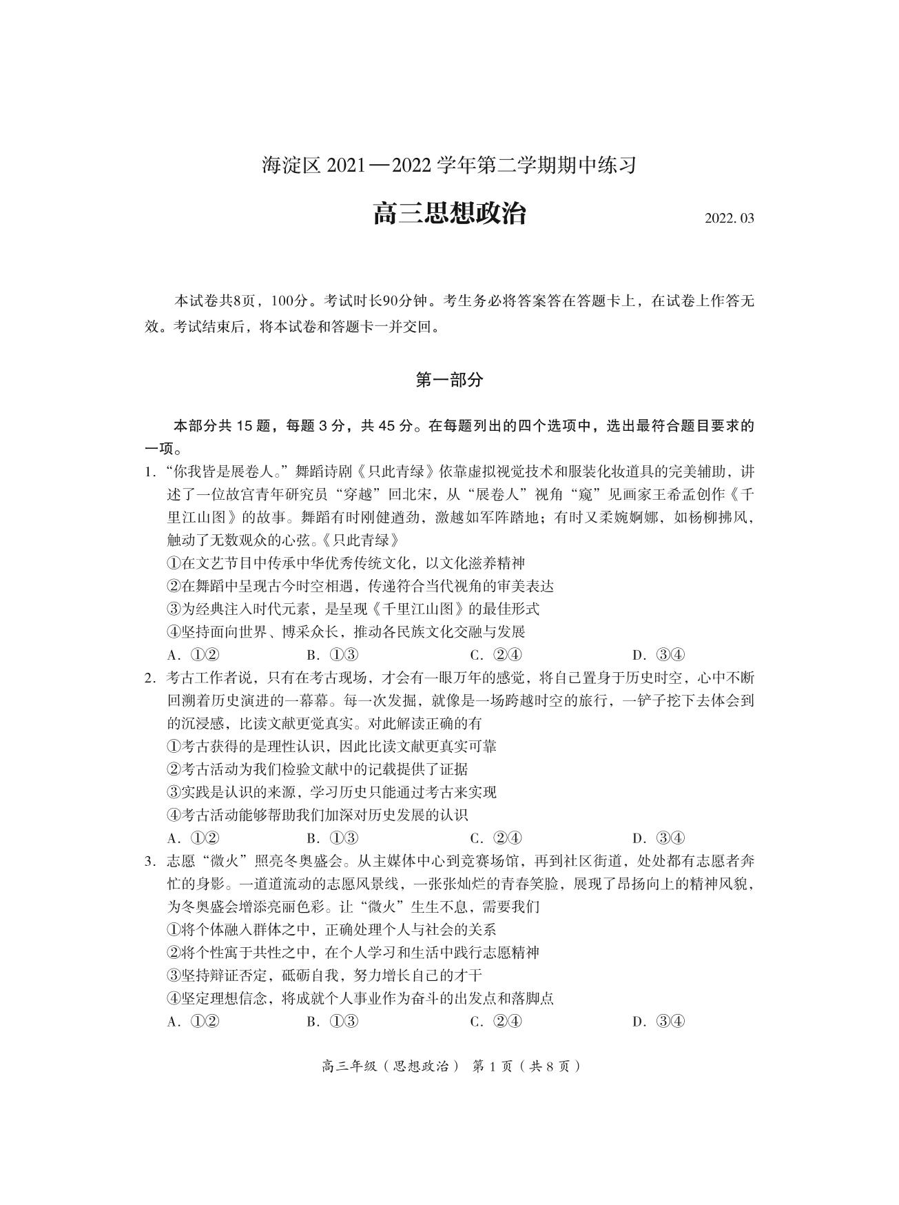 北京市海淀区2022年高考第一次模拟测试试卷思想政治