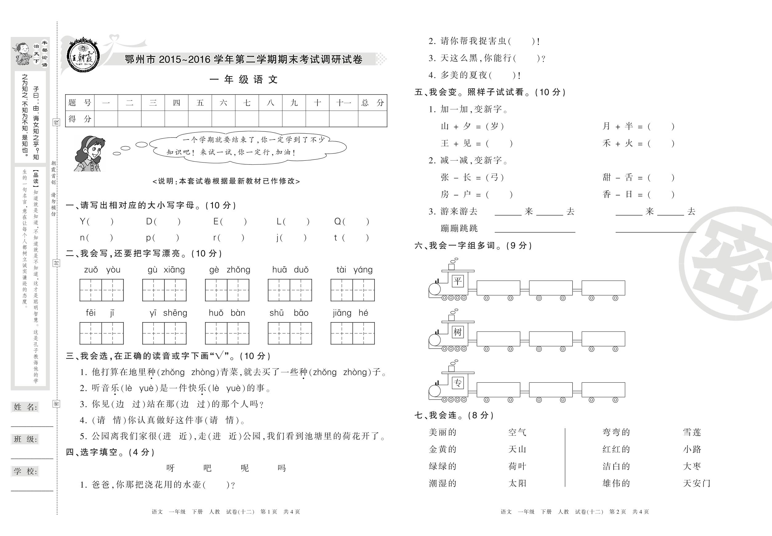 2015-2016学年第二学期鄂州市一年级语文试卷(人教版)【12】