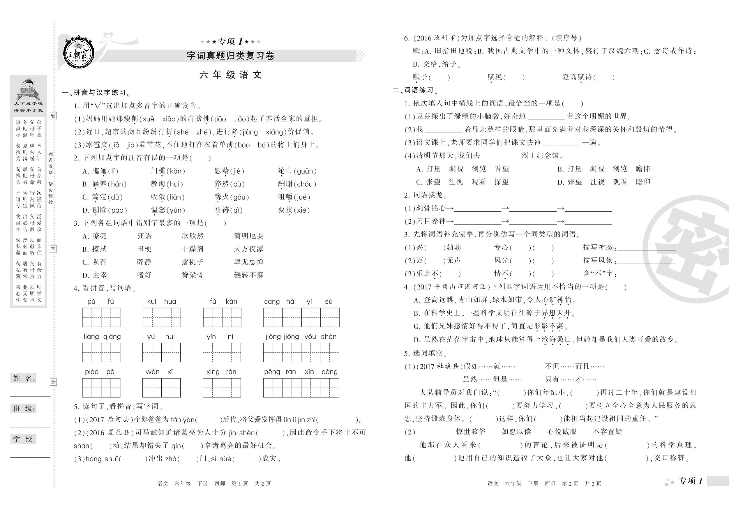 王朝霞期末专项卷——字词、句子真题归类复习卷六年级下册语文(西师版)_R21080230543【0】
