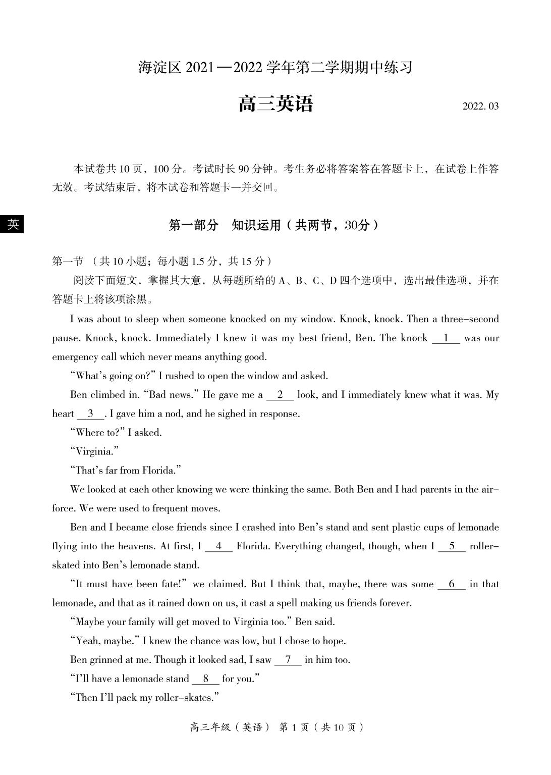 北京市海淀区2022年高考第一次模拟测试试卷英语【无听力音频】
