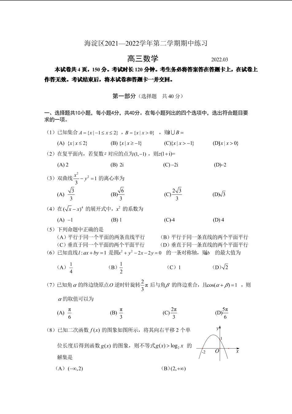 北京市海淀区2022年高考第一次模拟测试试卷数学