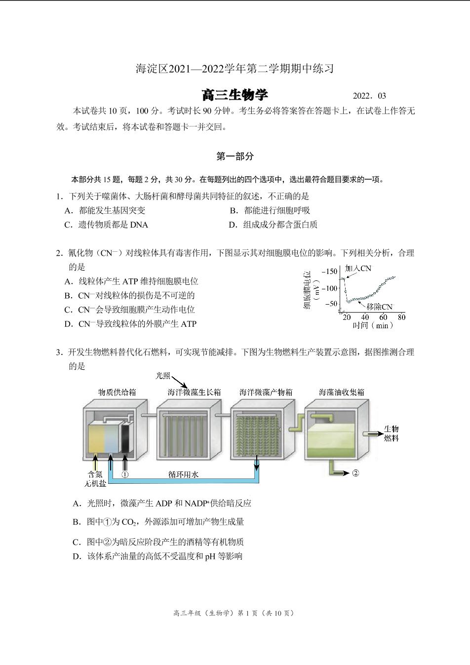 北京市海淀区2022年高考第一次模拟测试试卷生物