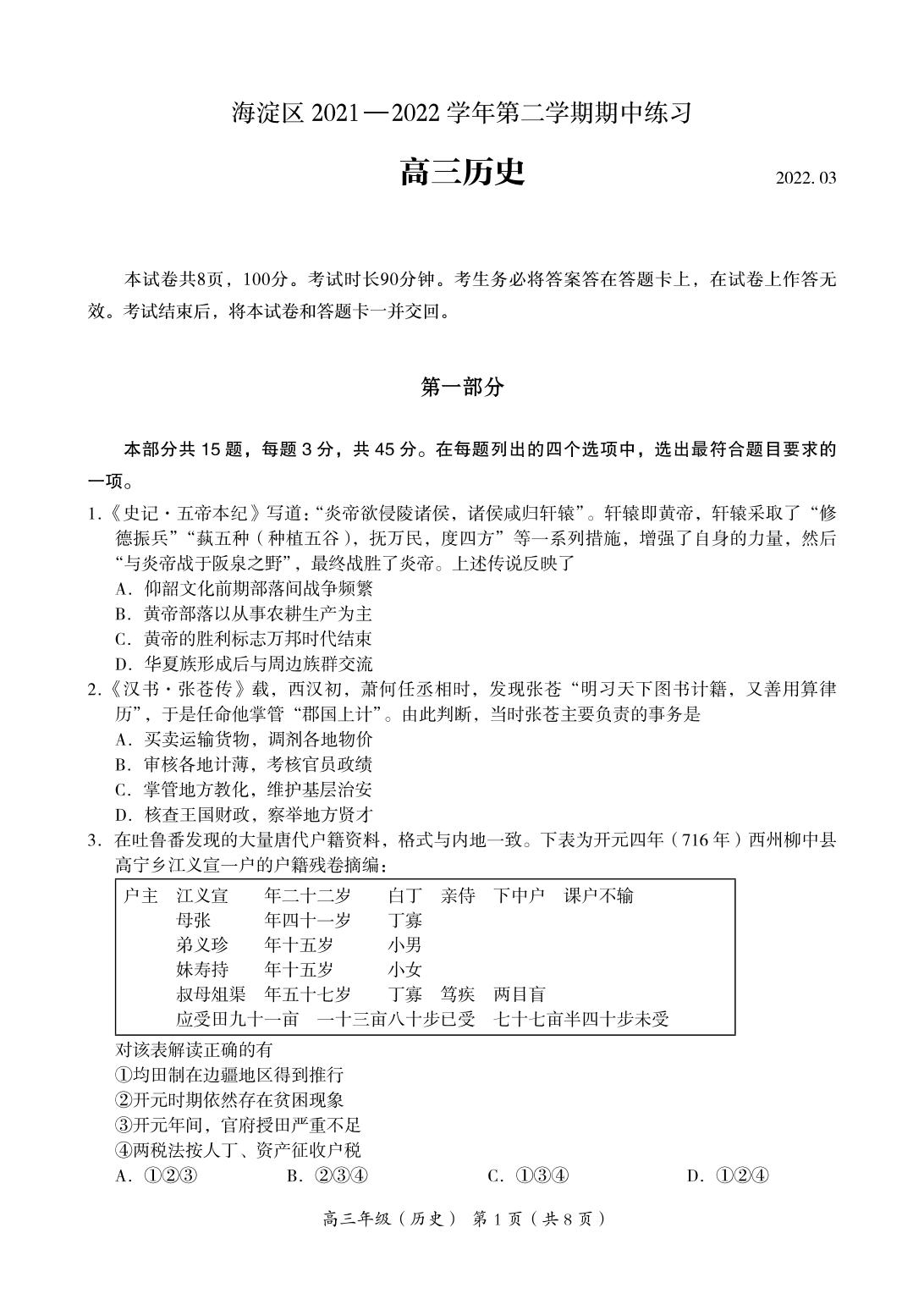北京市海淀区2022年高考第一次模拟测试试卷历史