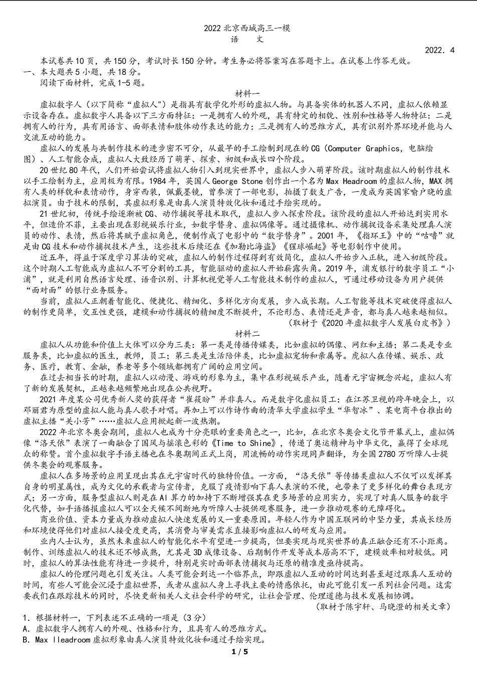 北京市西城区2022年高考第一次模拟测试试卷语文