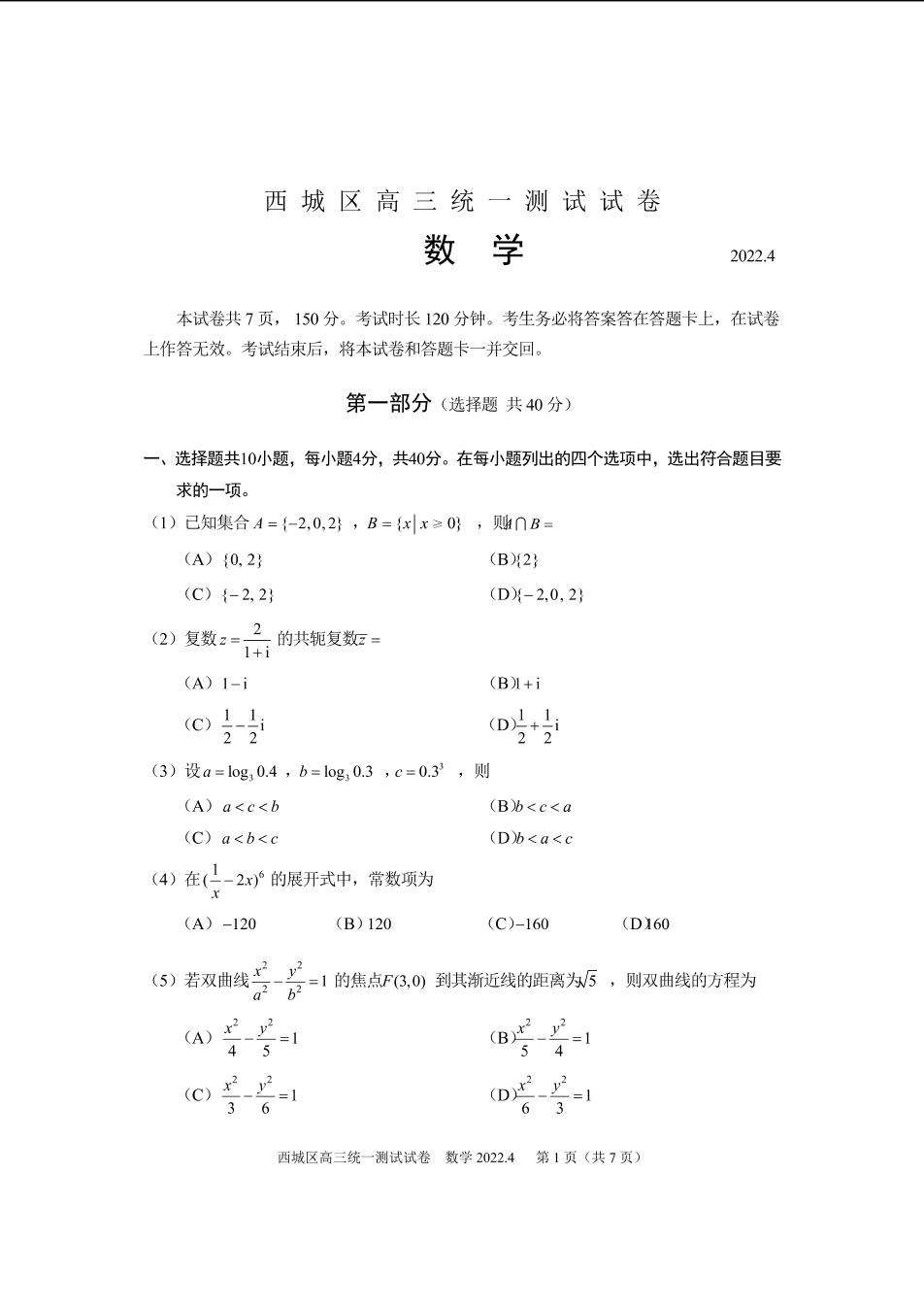 北京市西城区2022年高考第一次模拟测试试卷数学
