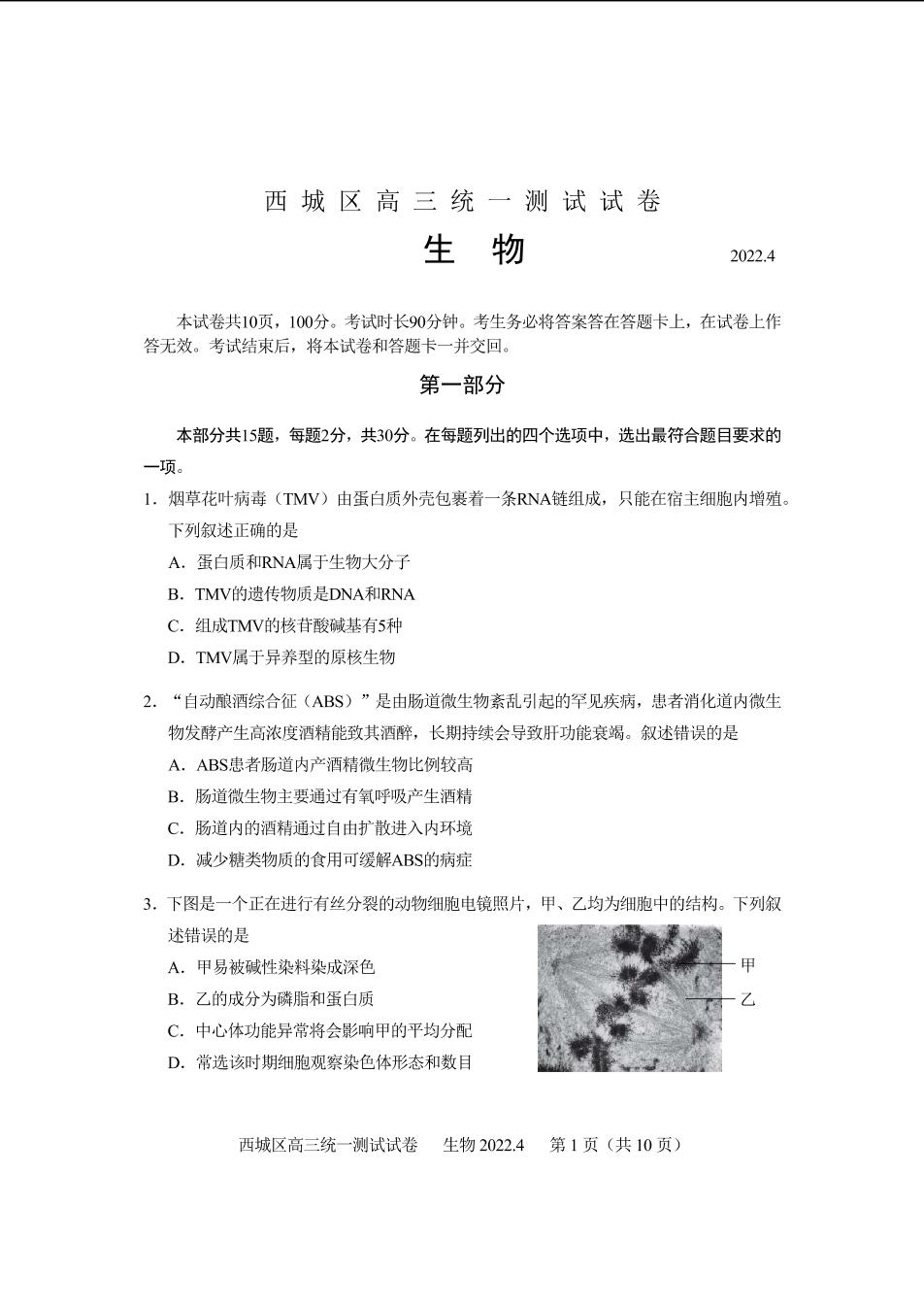 北京市西城区2022年高考第一次模拟测试试卷生物