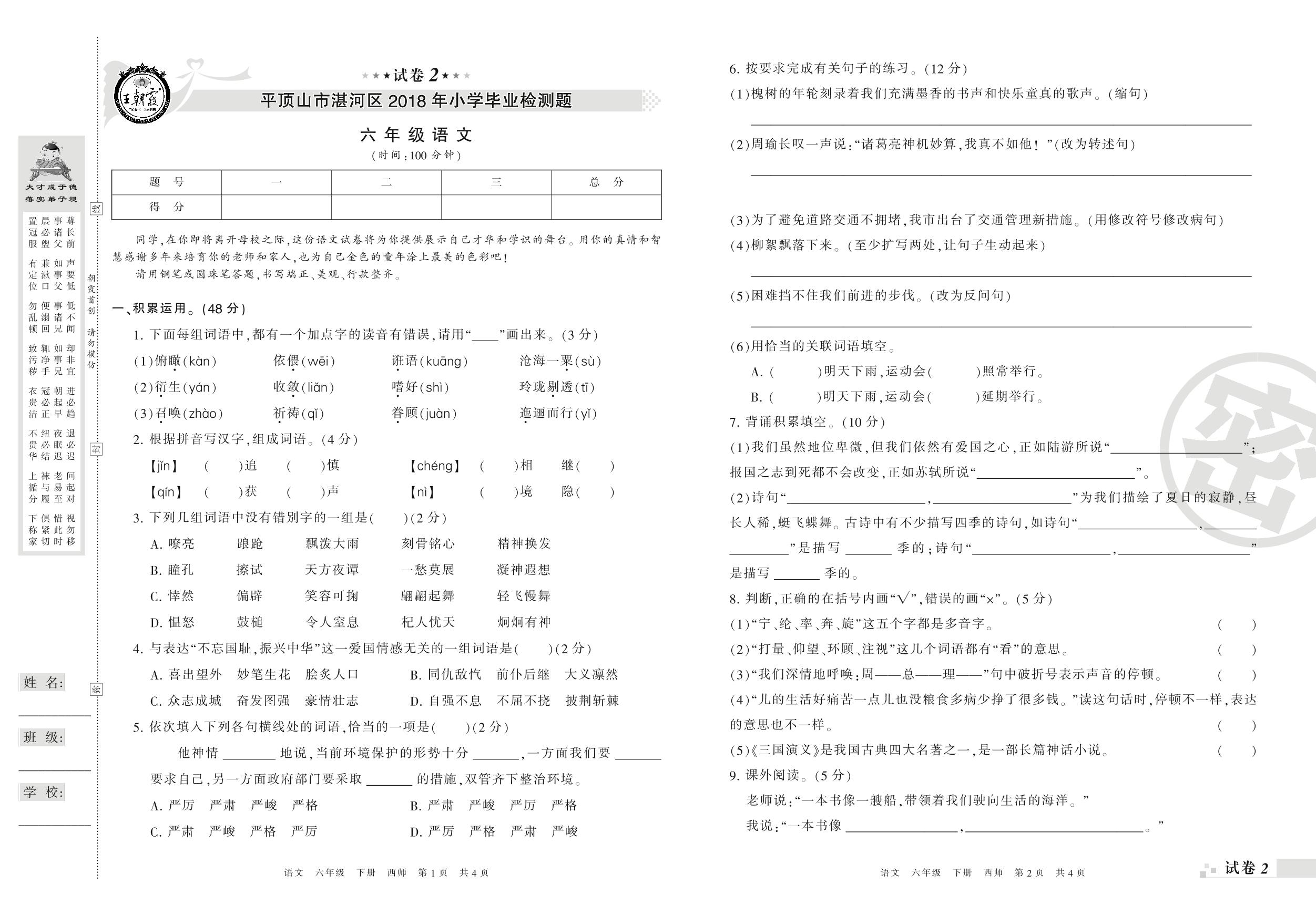 2017-2018学年第二学期平顶山市湛河区六年级语文试卷(西师版)【2】