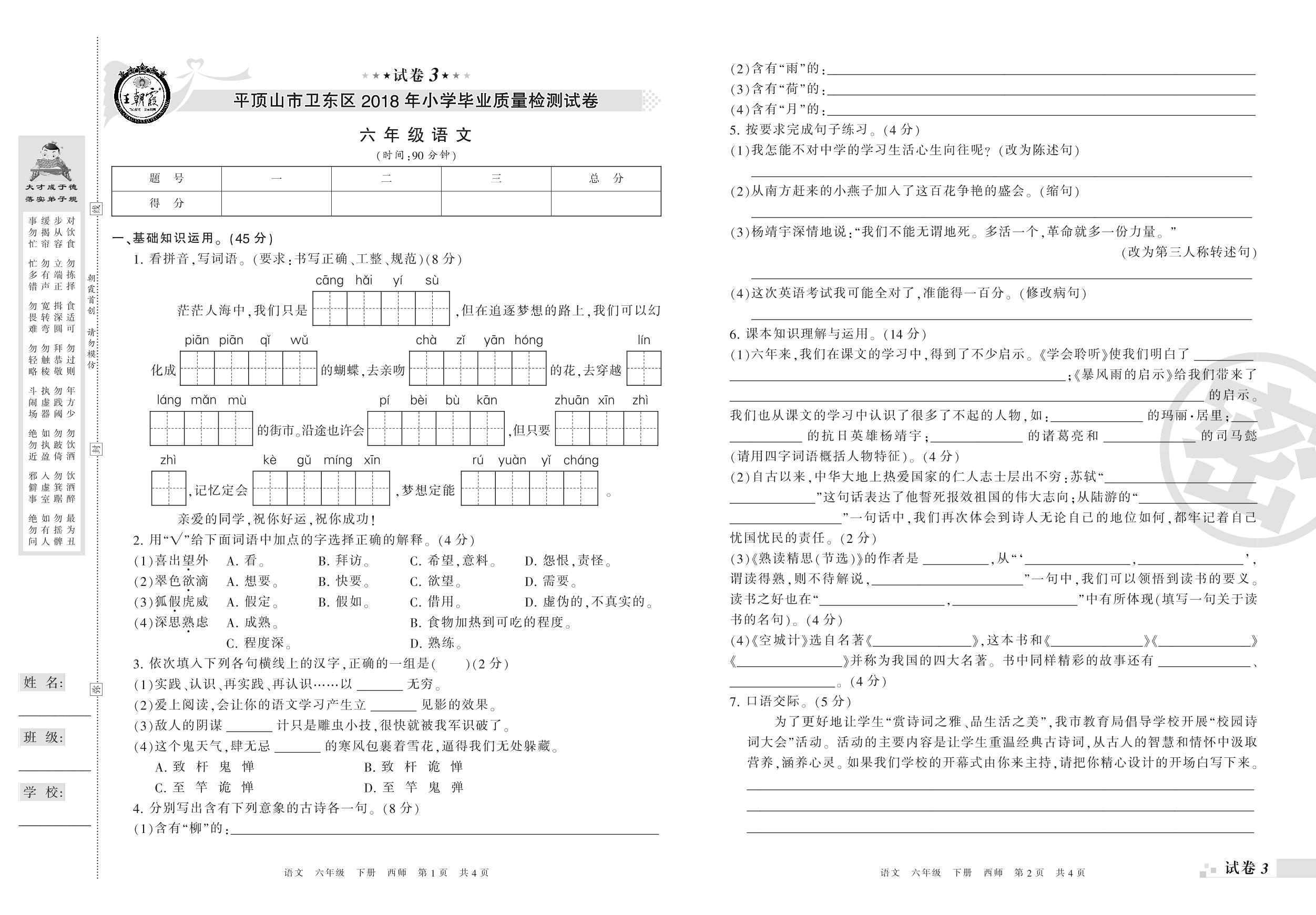 2017-2018学年第二学期平顶山市卫东区六年级语文试卷(西师版)【3】
