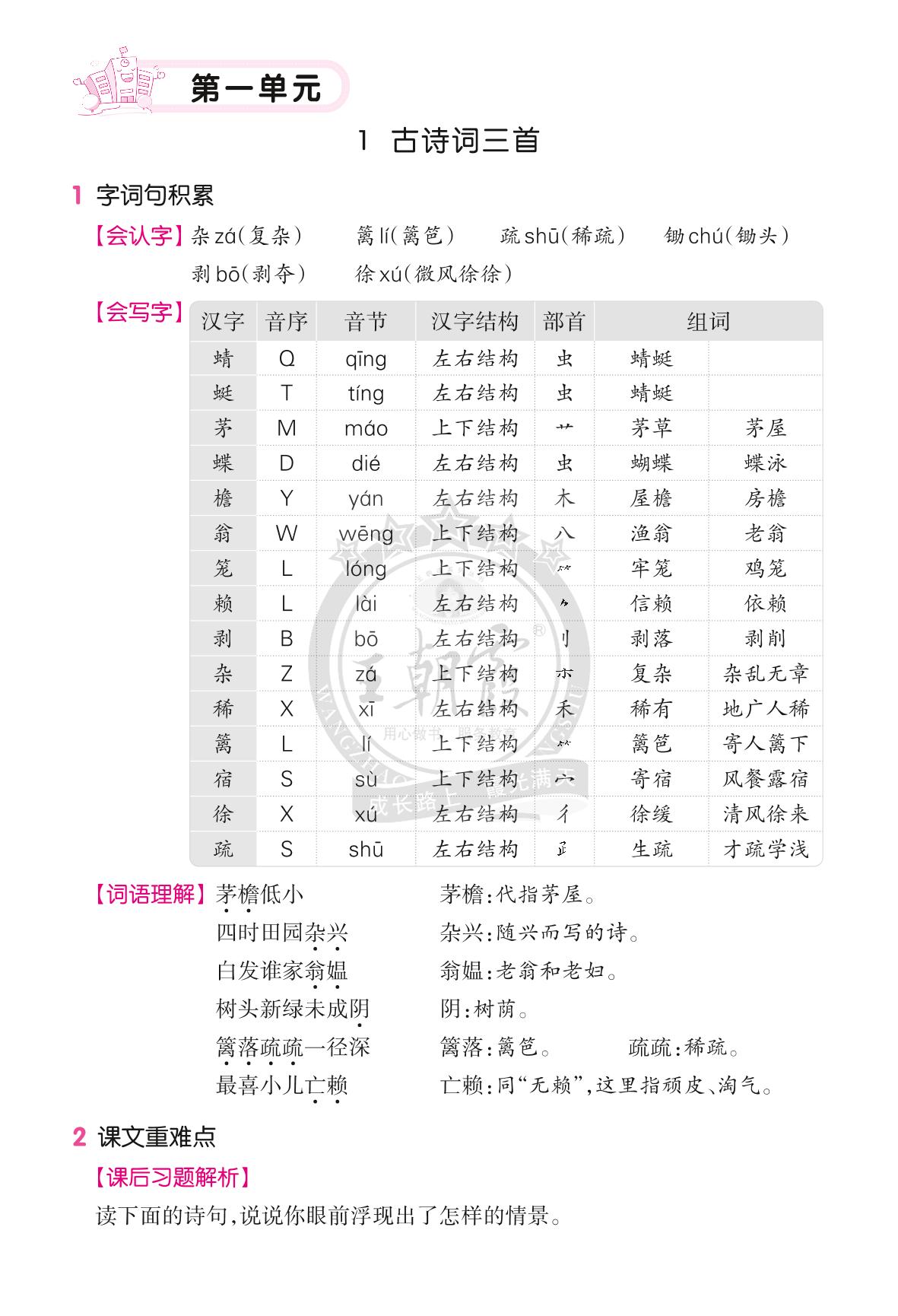 人教版·四年级·语文词句段、课后习题、语文园地知识点梳理(第一单元)