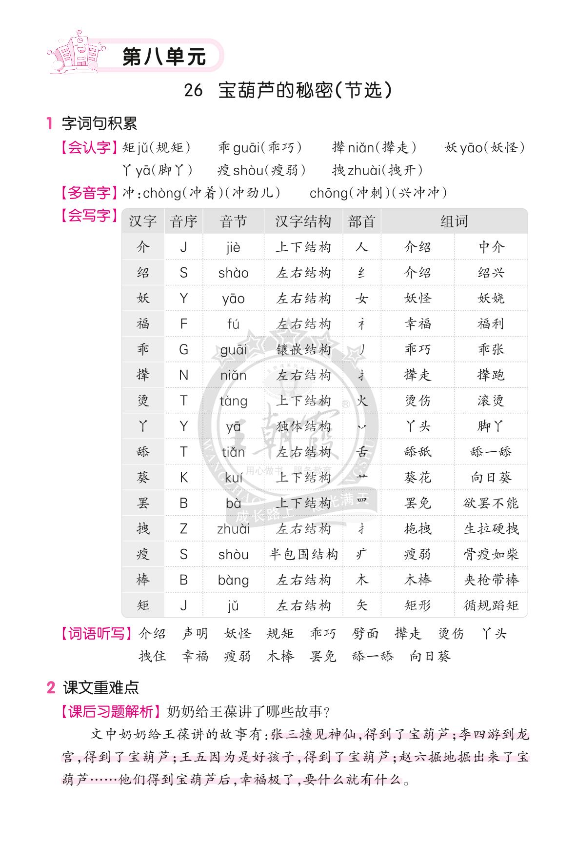 人教版·四年级·语文字词句段、课后习题、语文园地知识点梳理(第八单元)