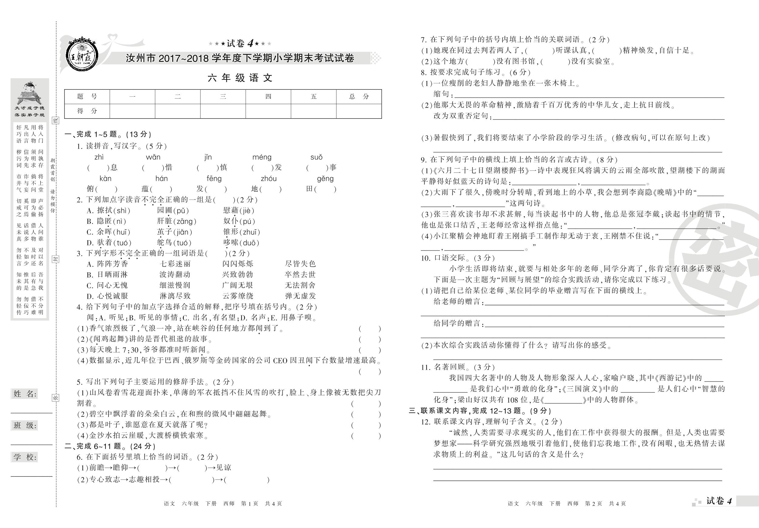 2017-2018学年第二学期汝州市六年级语文试卷(西师版)【4】