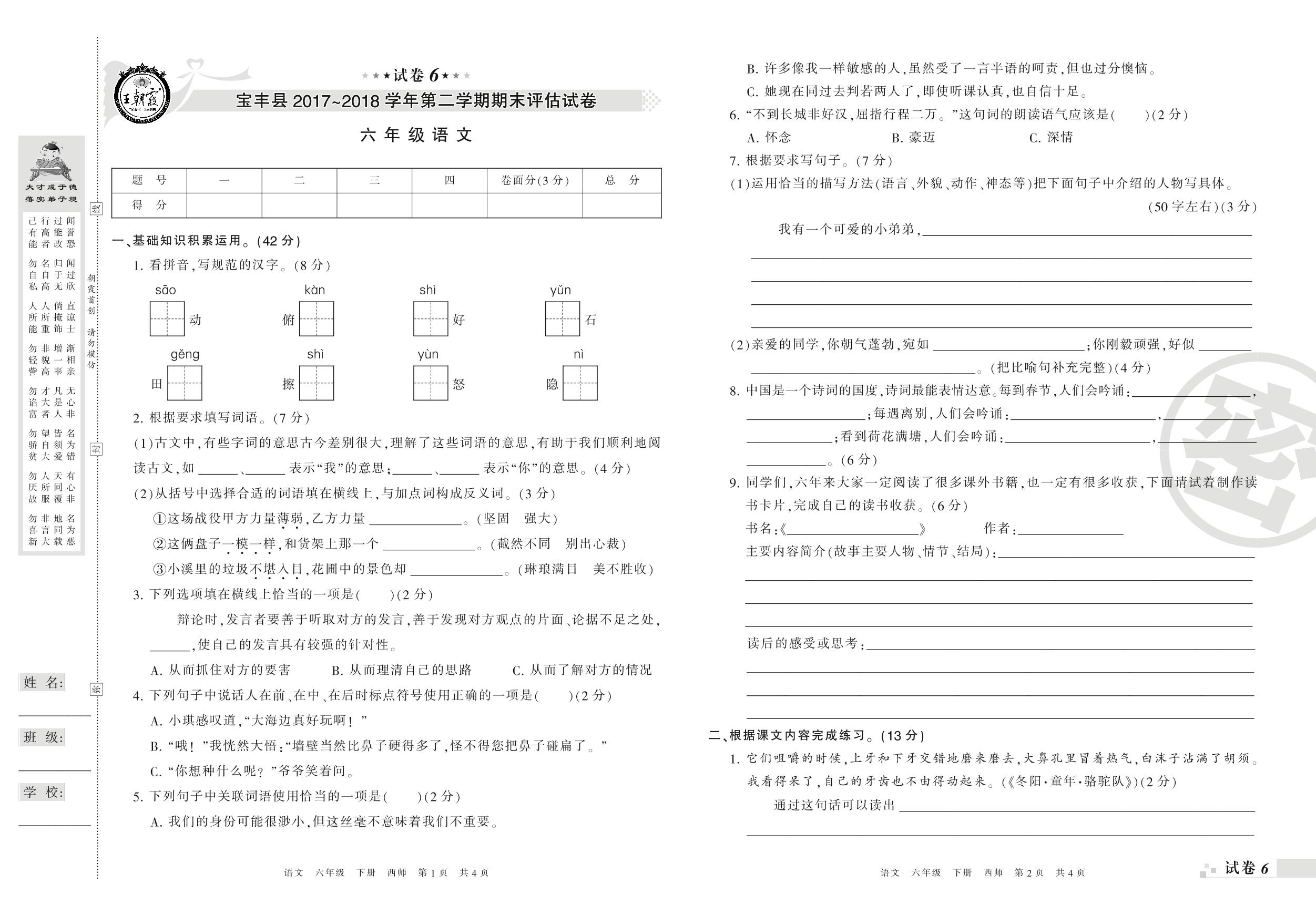 2017-2018学年第二学期平顶山市宝丰县六年级语文试卷(西师版)【6】