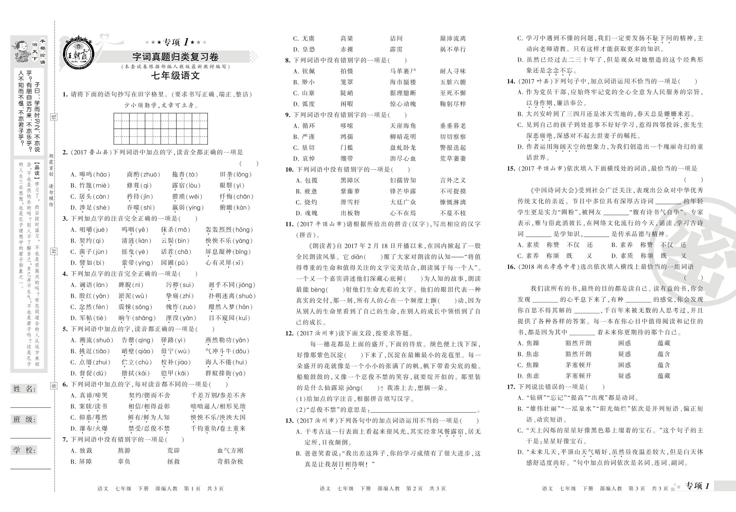 王朝霞期末专项卷——字词、句子真题归类复习卷七年级下册语文(人教版)_R21080230648【0】