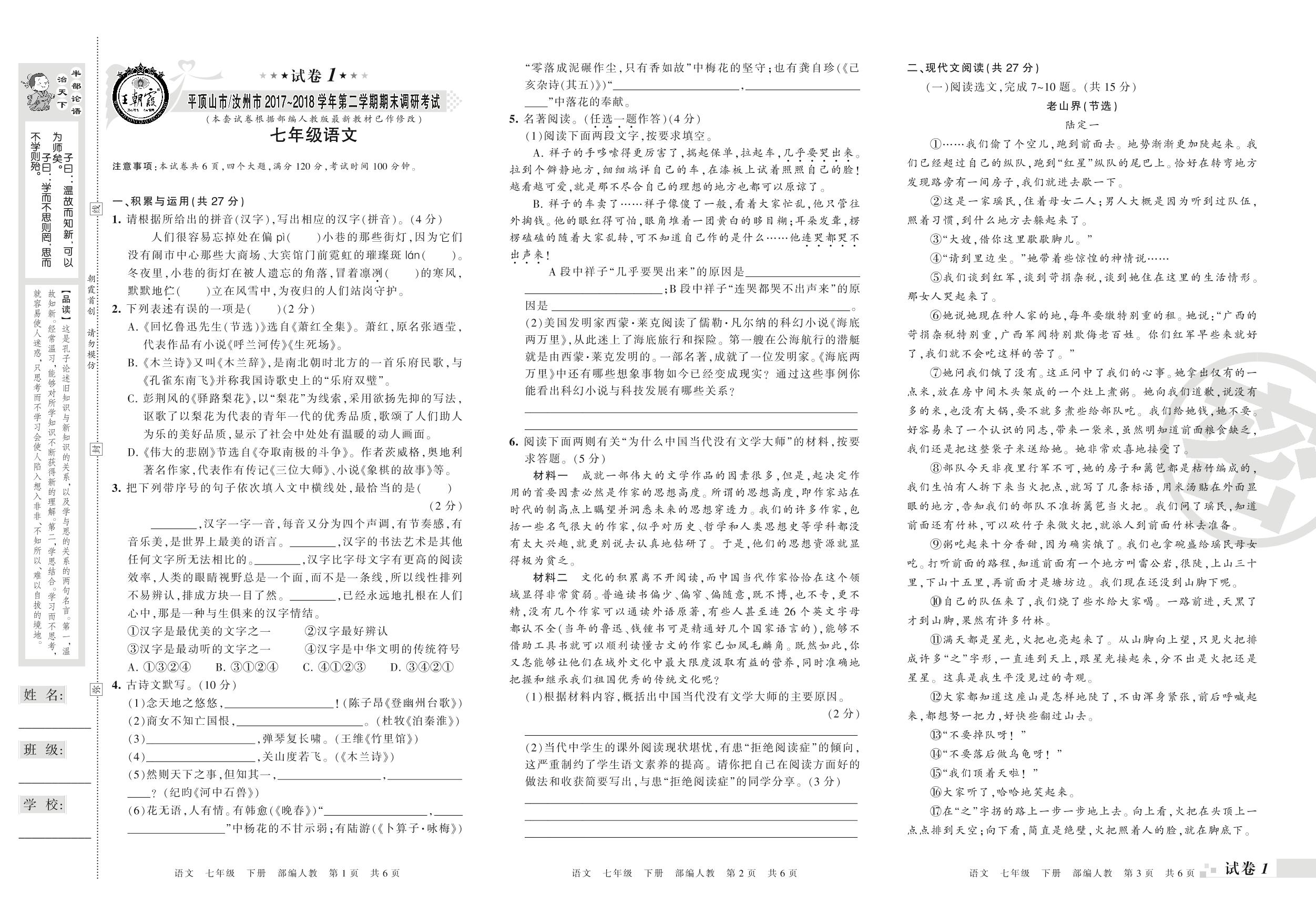 2017-2018学年第二学期平顶山市、汝州市七年级语文试卷(人教版)【1】