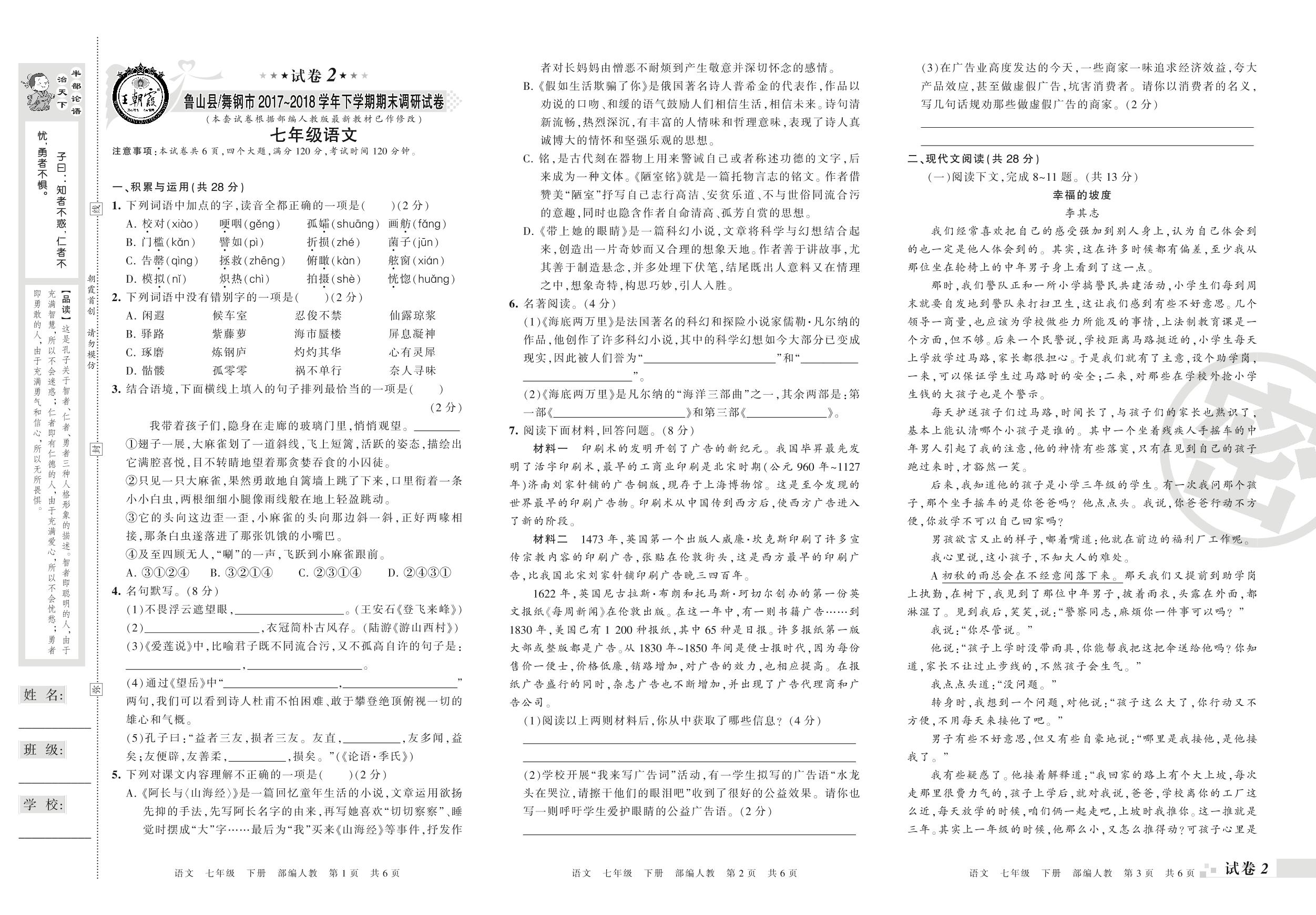 2017-2018学年第二学期鲁山县、舞钢市七年级语文试卷(人教版)【2】