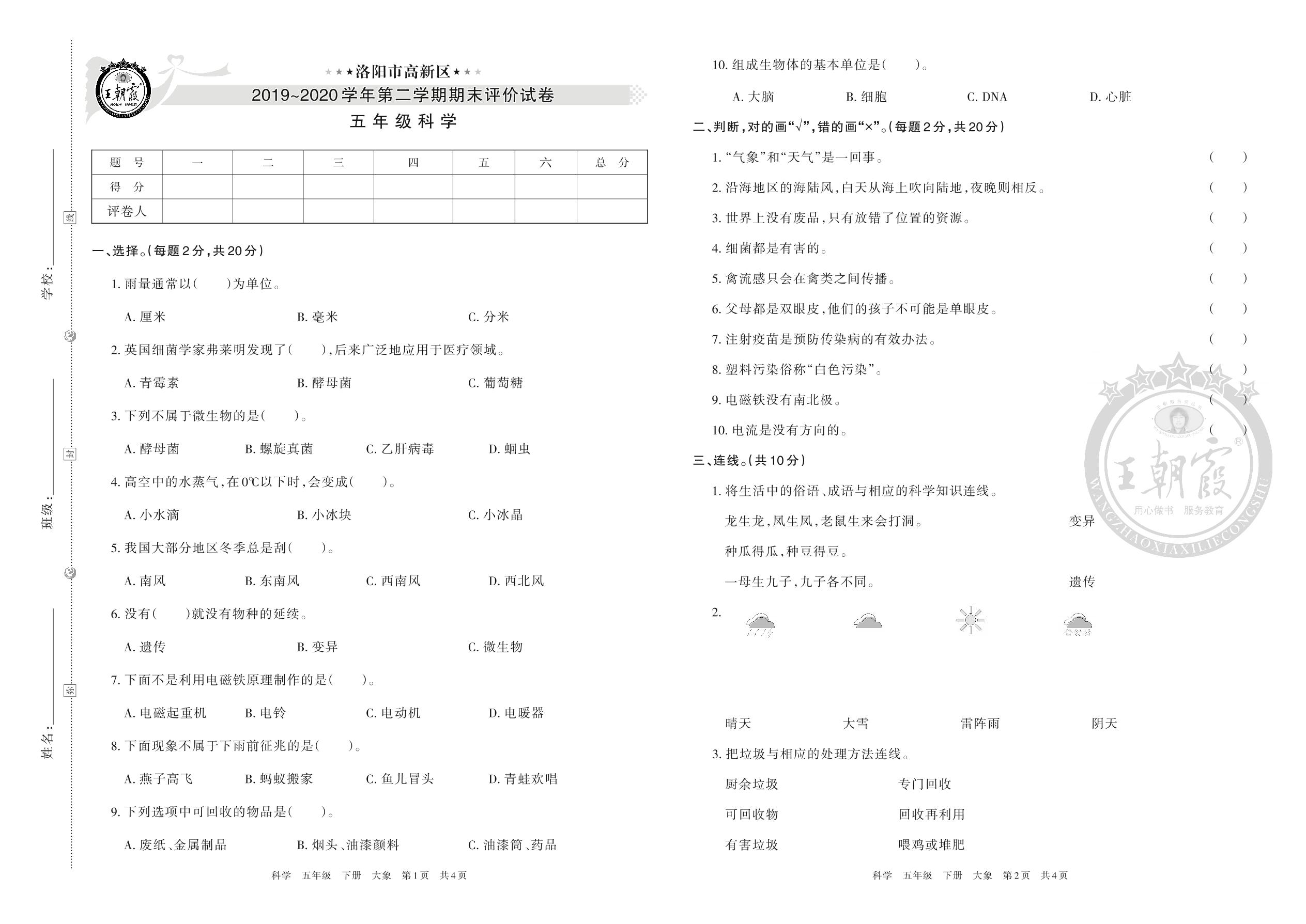 洛阳市高新区2019~2020学年第二学期期末评价试卷五年级科学(大象版)