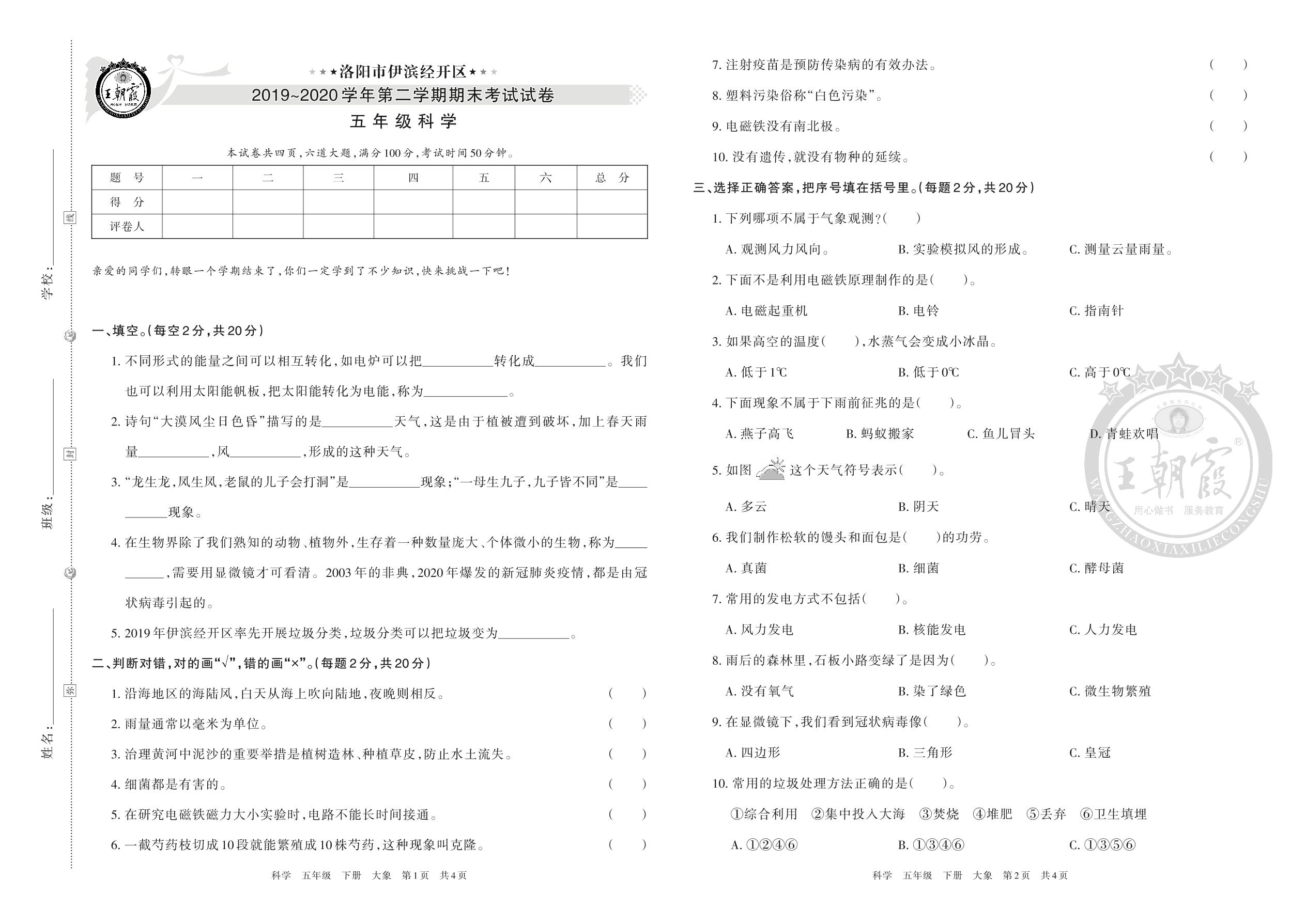 洛阳市伊滨经开区2019~2020学年第二学期期末考试试卷五年级科学(大象版)