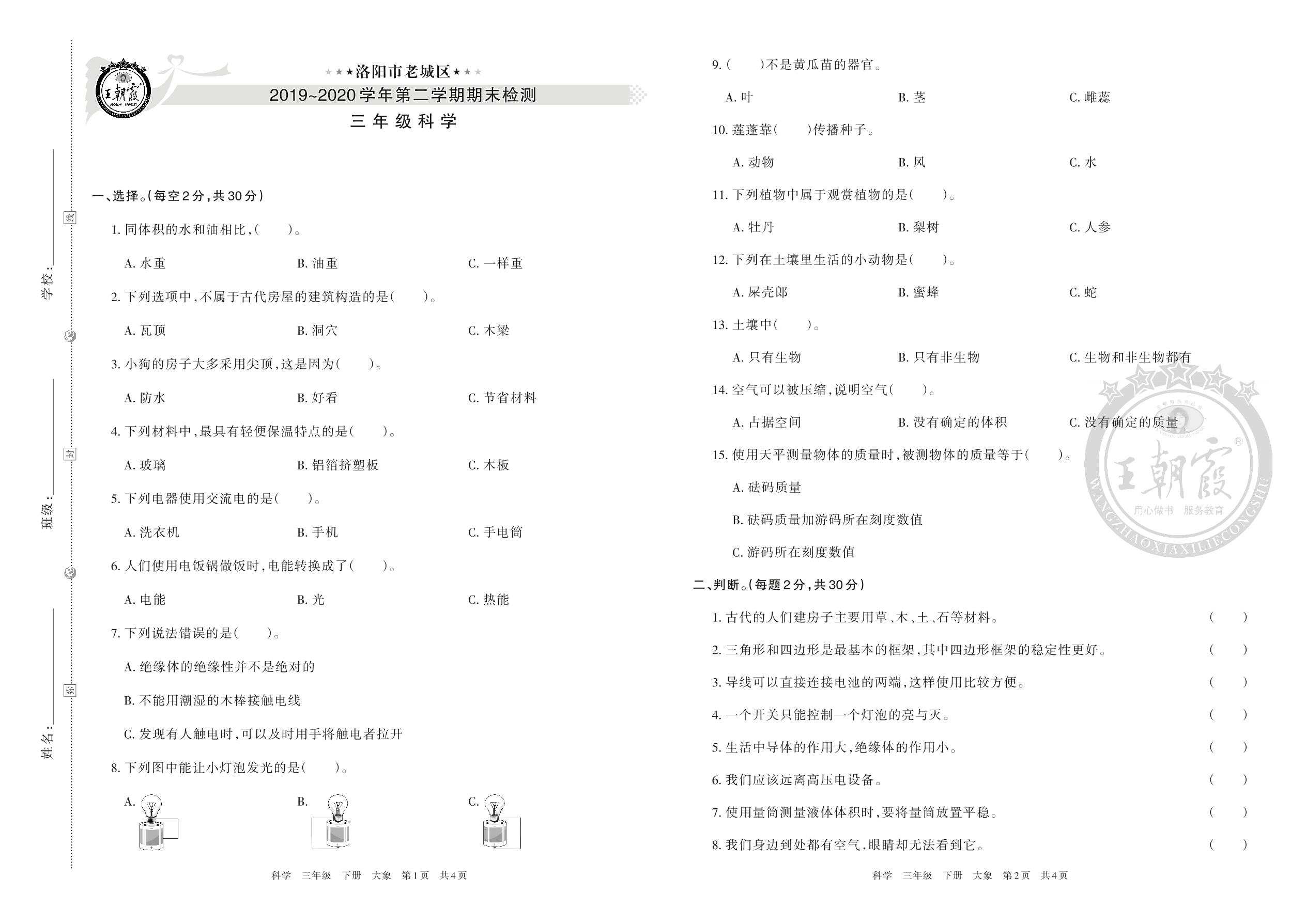 洛阳市老城区2019~2020学年第二学期期末检测三年级科学(大象版)