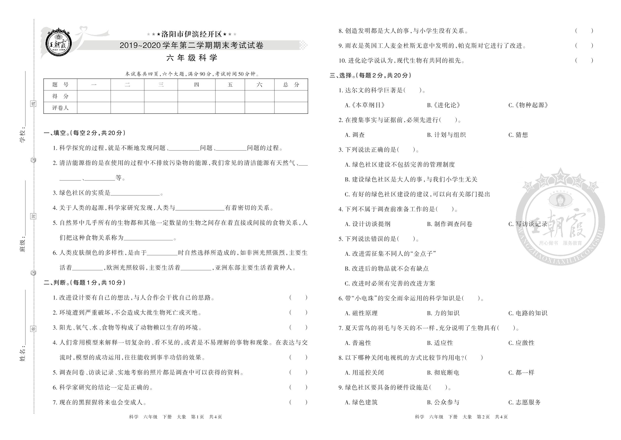 洛阳市伊滨经开区2019~2020学年第二学期期末考试试卷六年级科学(大象版)