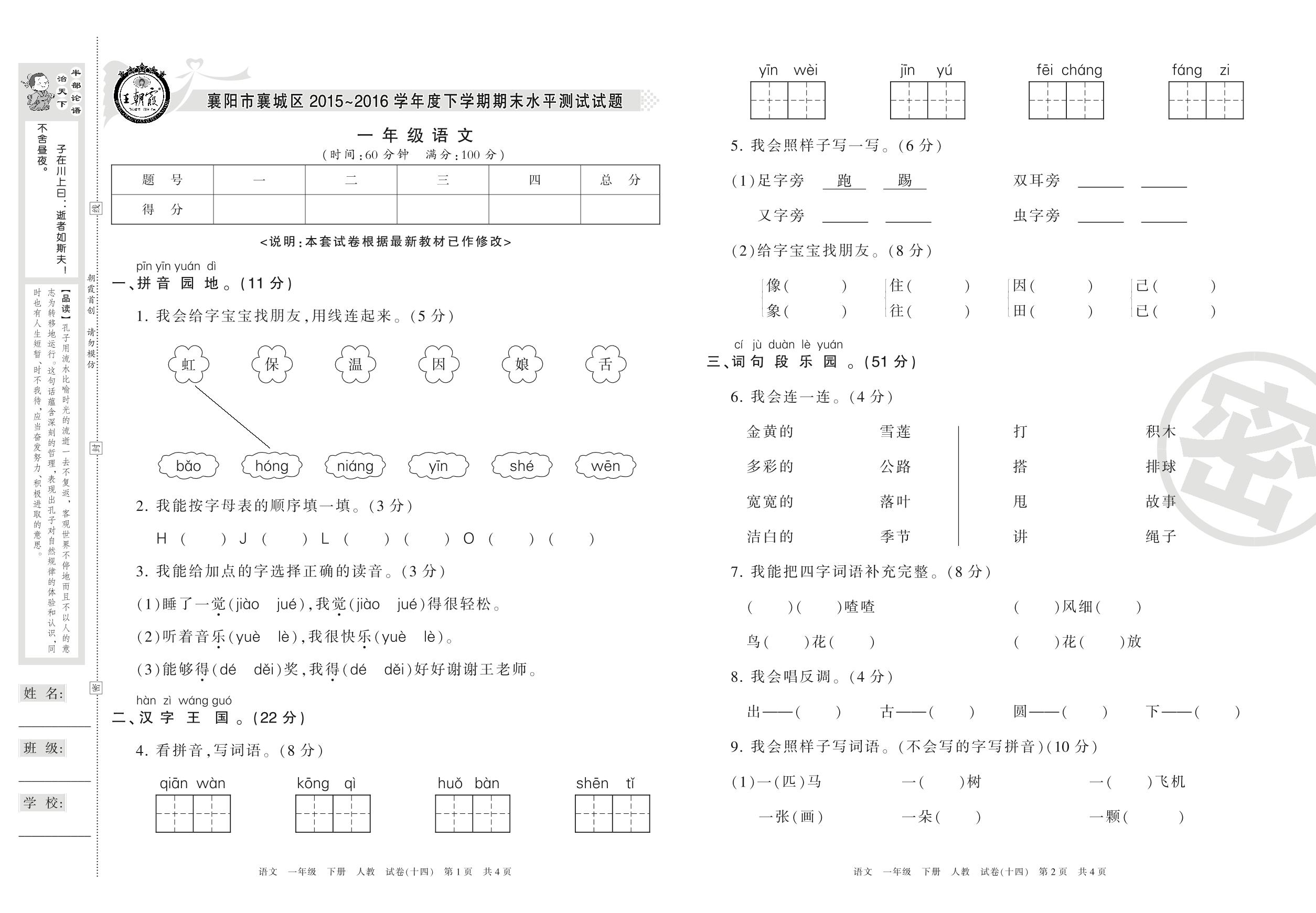 2015-2016学年第二学期襄阳市襄城区一年级语文试卷(人教版)【14】