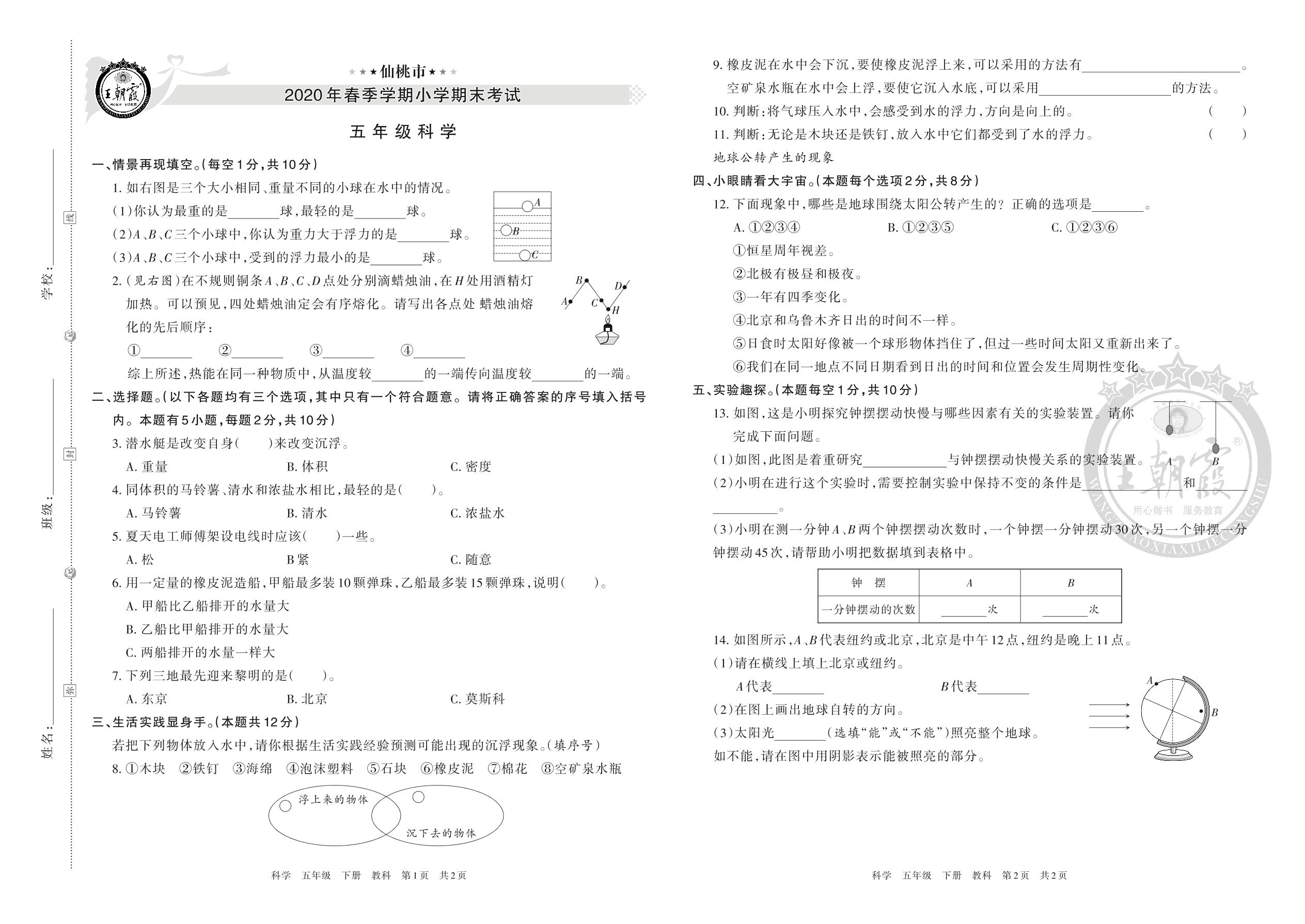 仙桃市2020年春季学期小学期末考试五年级科学(大象版)
