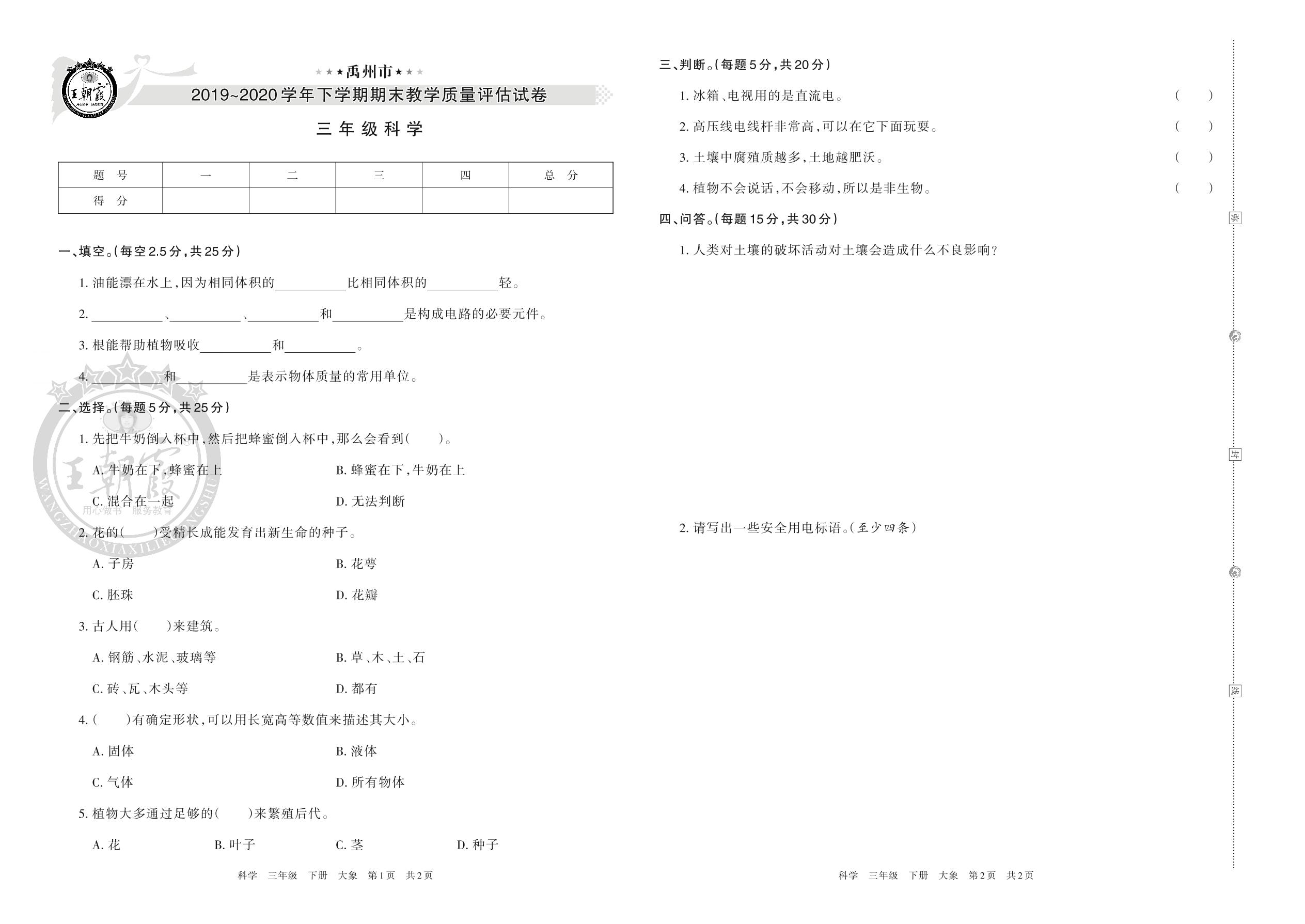 禹州市2019-2020学年下学期期末教学质量评估试卷三年级科学(大象版)