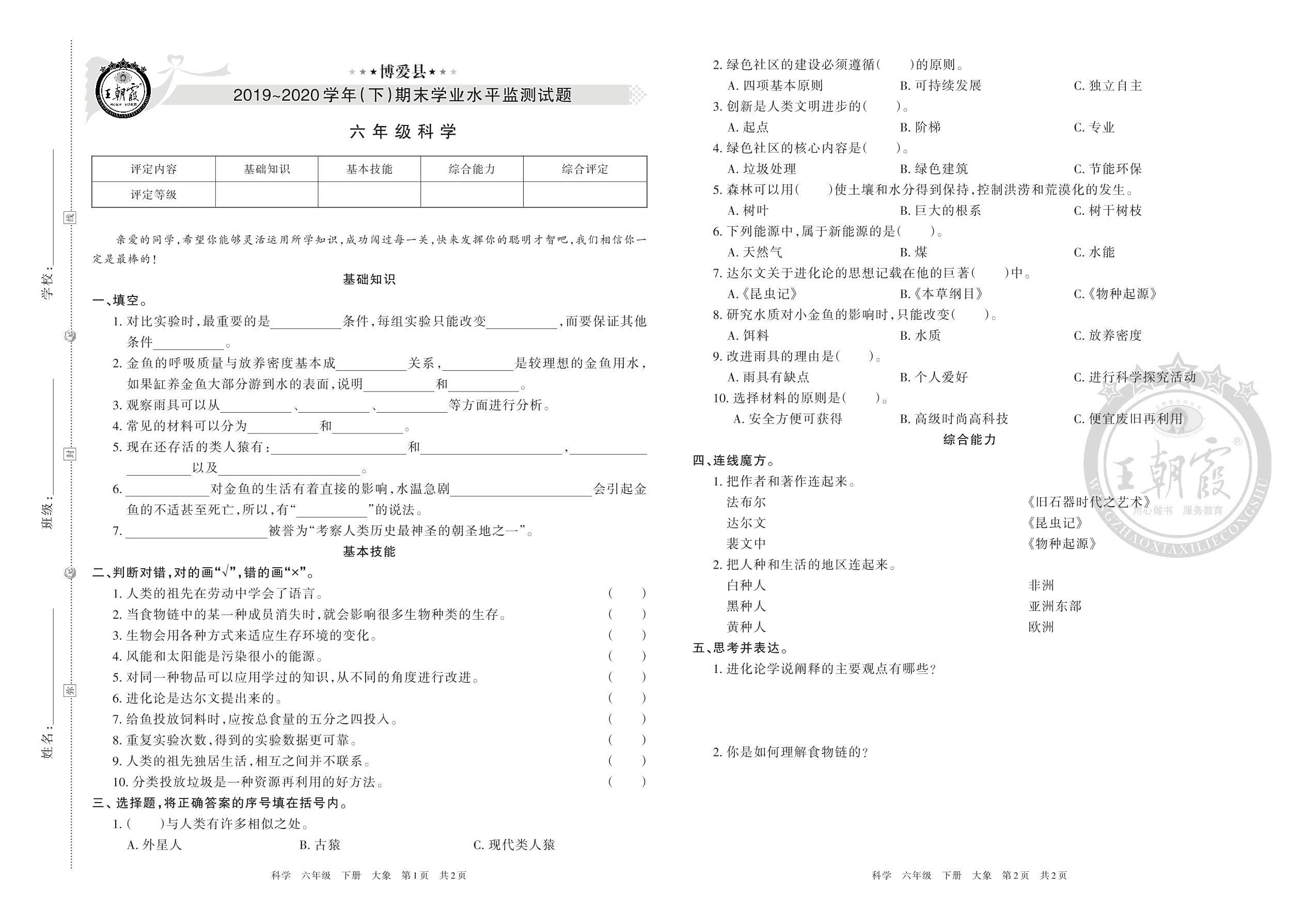博爱县2019-2020学年(下)期末学业水平监测试题六年级科学(大象版)