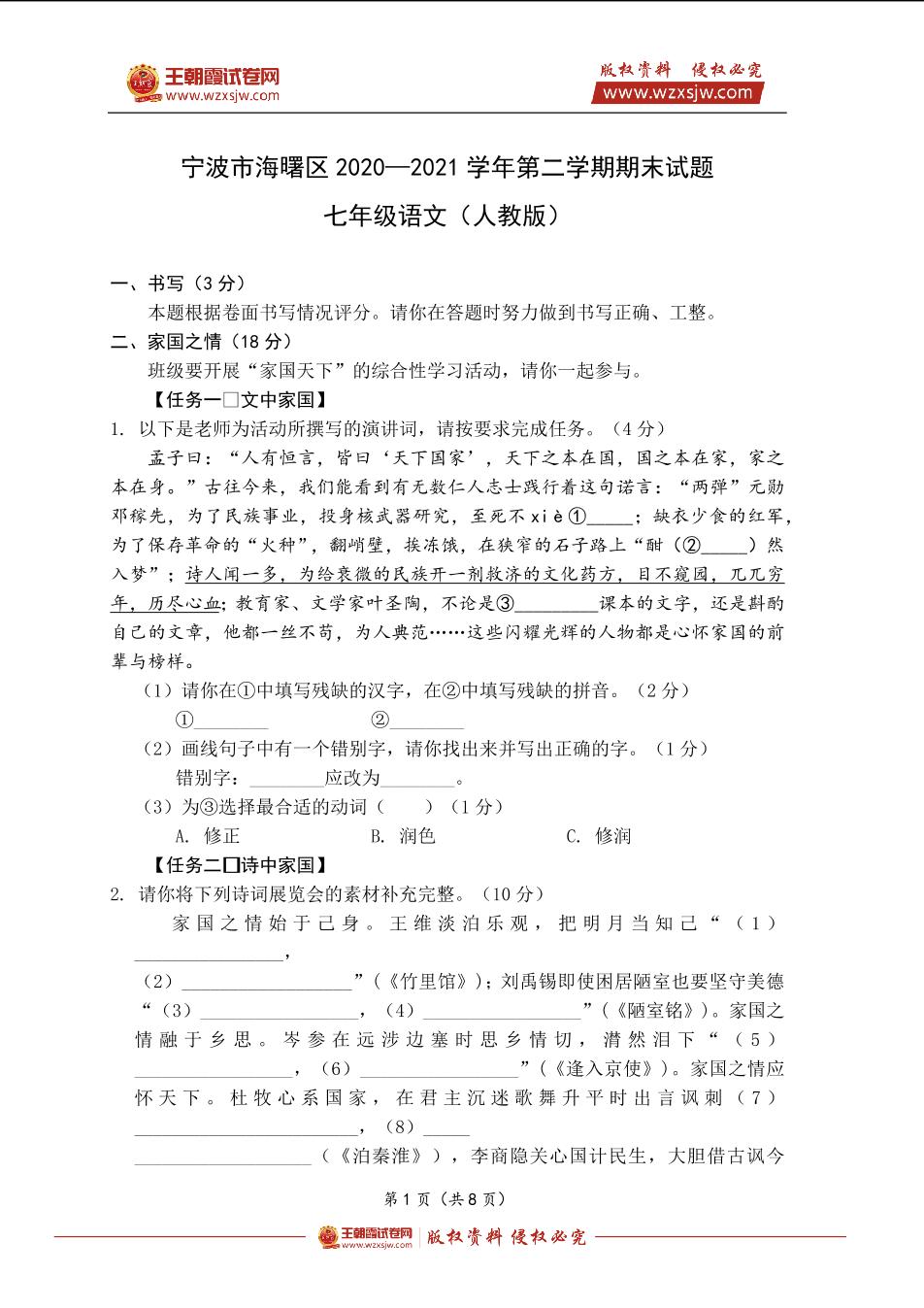 宁波市海曙区2020—2021学年第二学期期末试题七年级语文(人教版)
