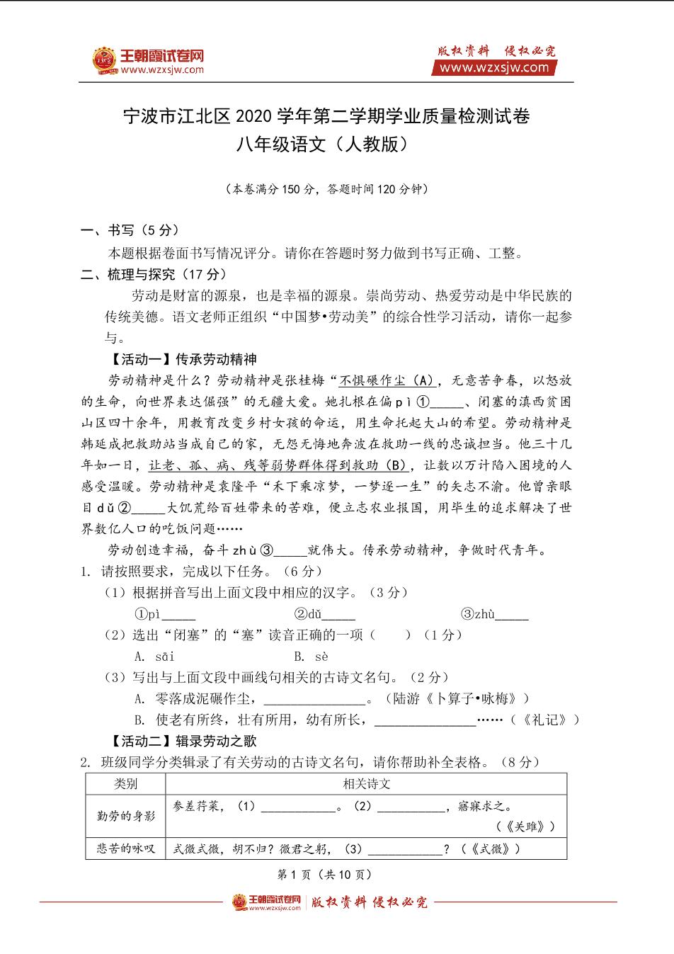 宁波市江北区2020学年第二学期学业质量检测试卷八年级语文(人教版)