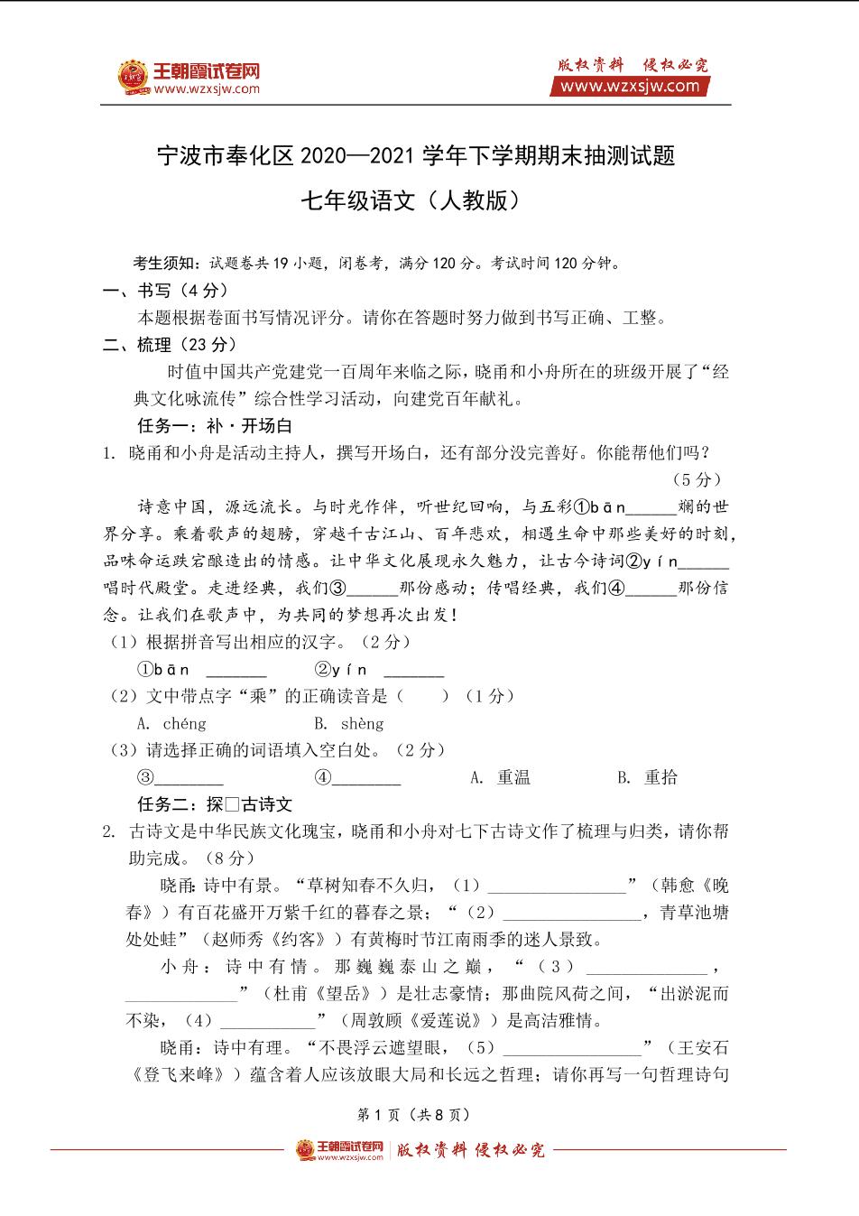 宁波市奉化区2020—2021学年下学期期末抽测试题七年级语文(人教版)