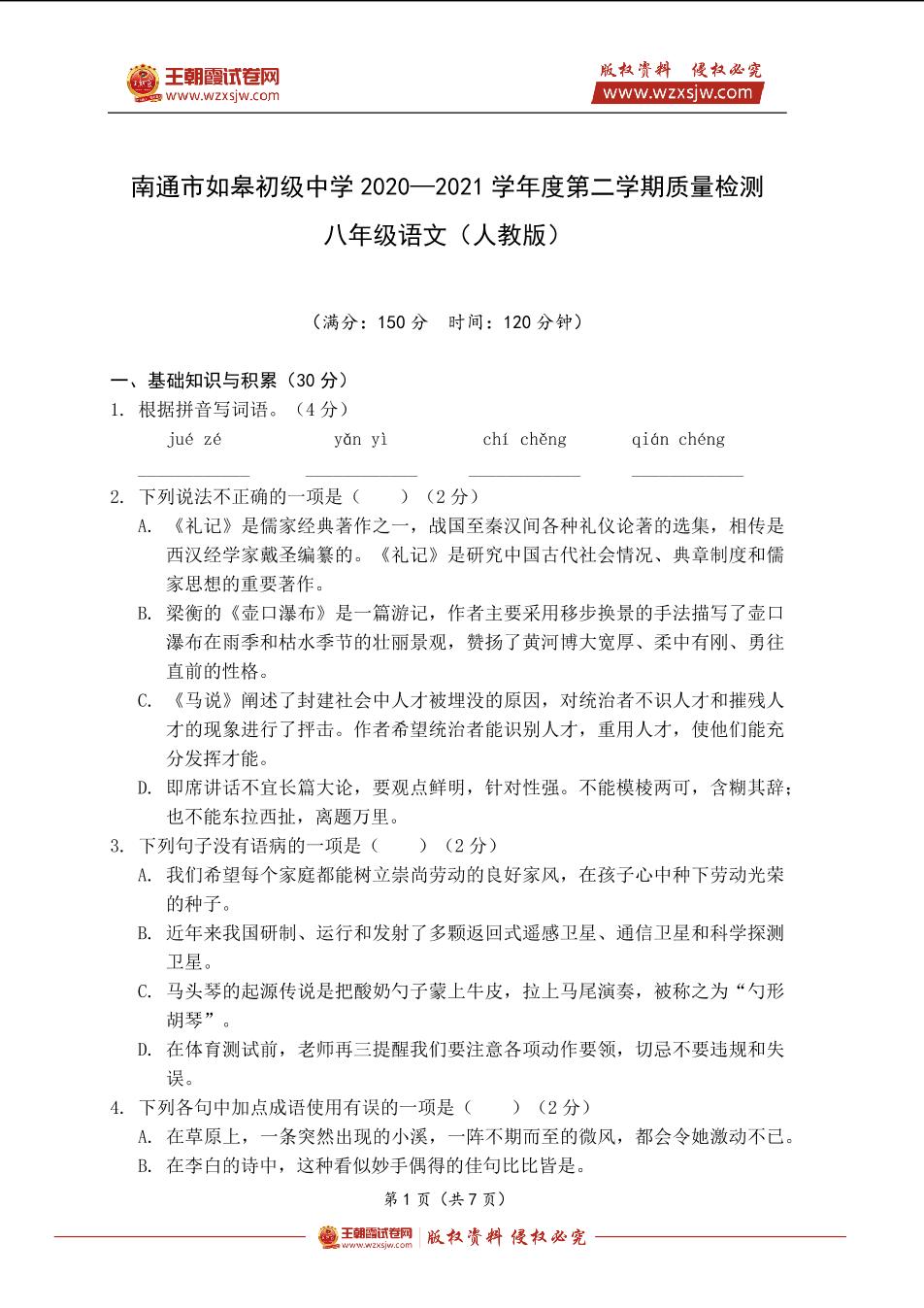 南通市如皋初级中学2020—2021学年度第二学期质量检测八年级语文(人教版)