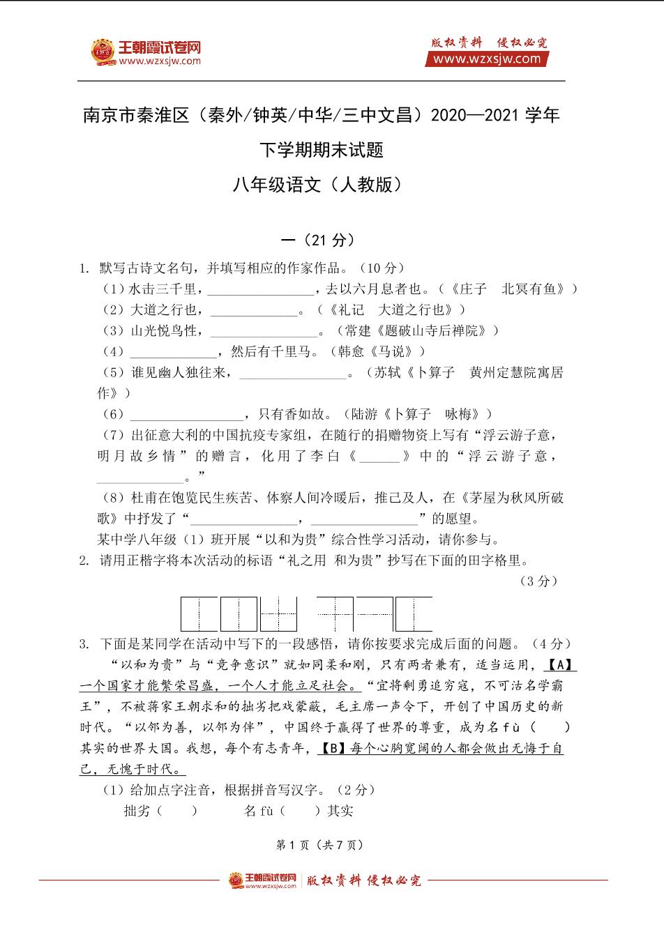 南京市秦淮区(秦外、钟英、中华、三中文昌)2020—2021学年下学期期末试题八年级语文(人教版)