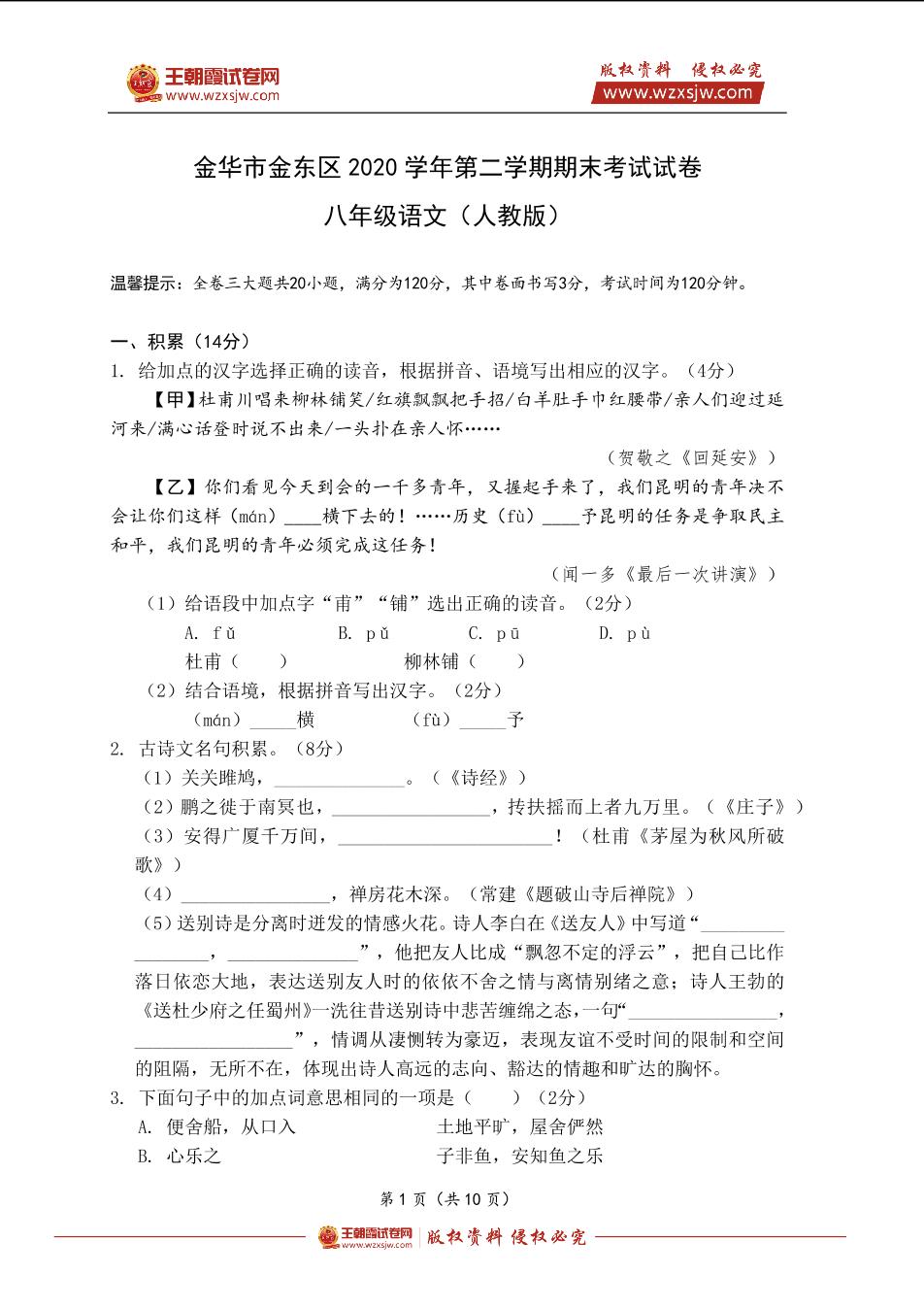金华市金东区2020学年第二学期期末考试试卷八年级语文(人教版)