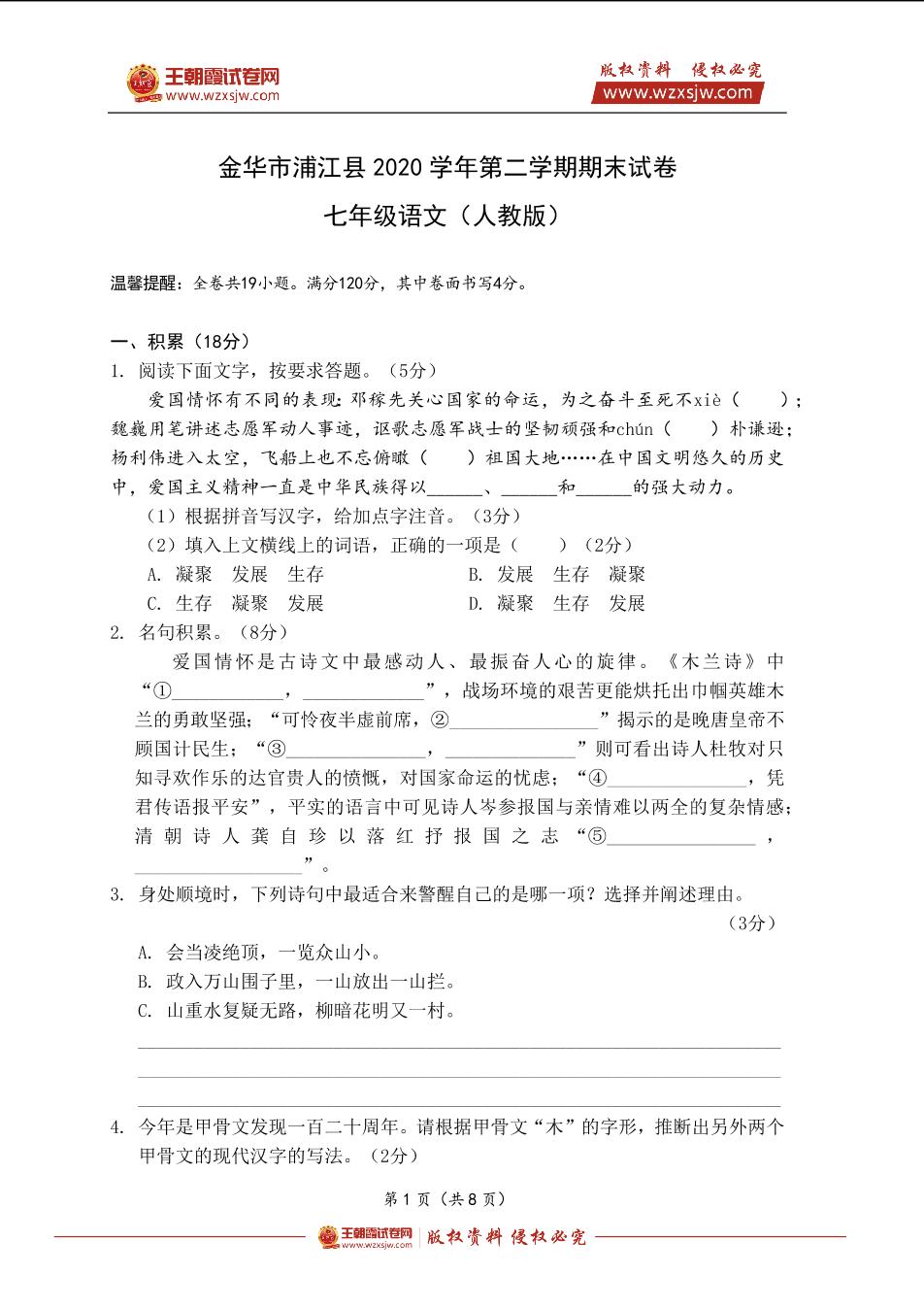 金华市浦江县2020学年第二学期期末试卷七年级语文(人教版)