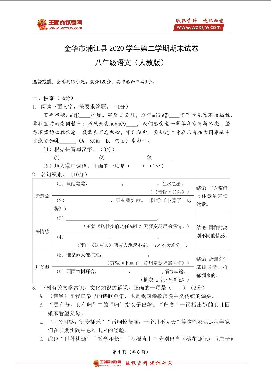 金华市浦江县2020学年第二学期期末试卷八年级语文(人教版)