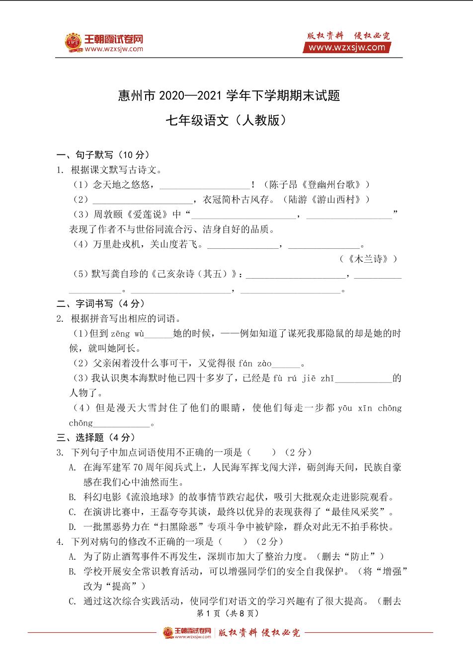惠州市2020—2021学年下学期期末试题七年级语文(人教版)