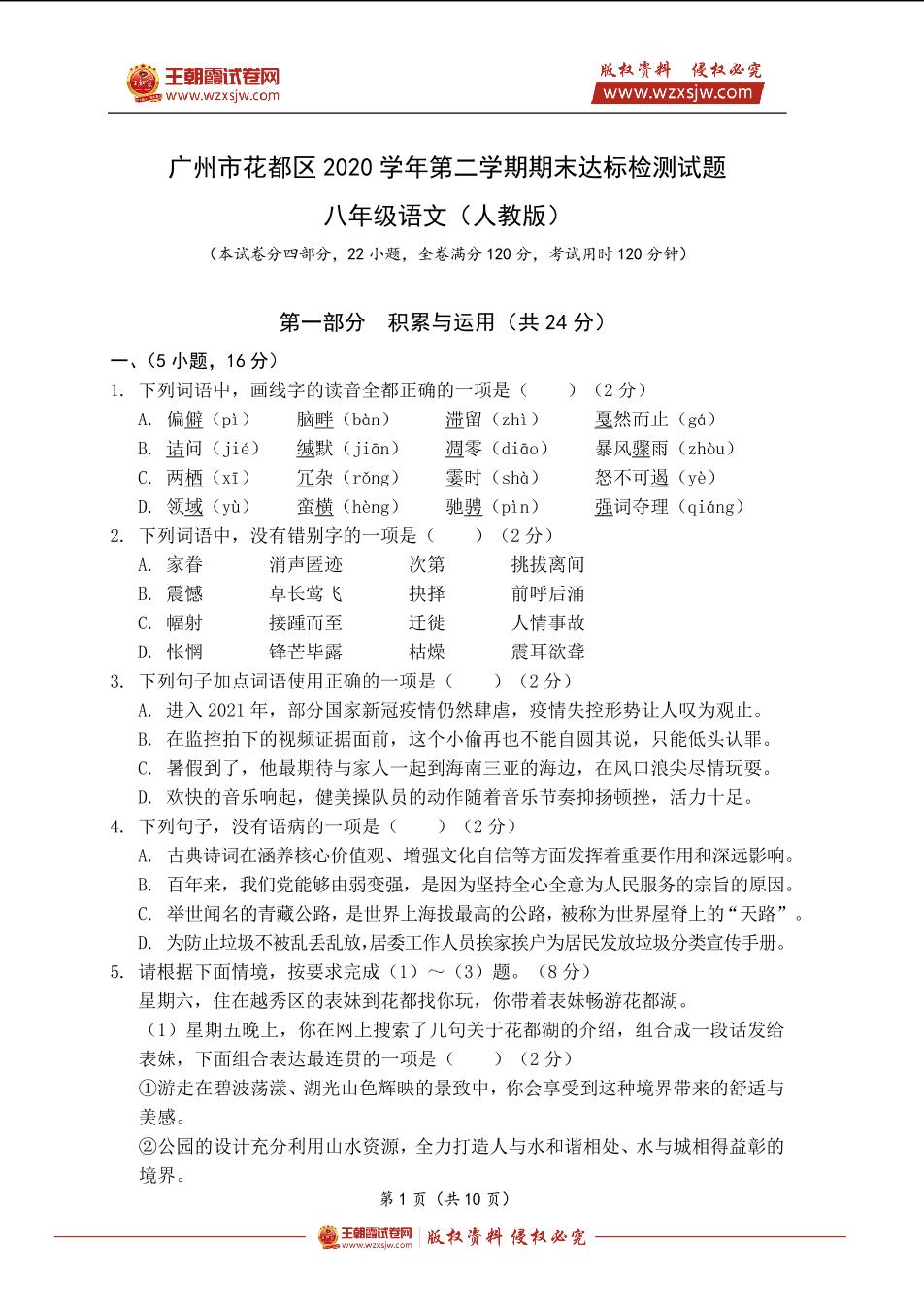 广州市花都区2020学年第二学期期末达标检测试题八年级语文(人教版)
